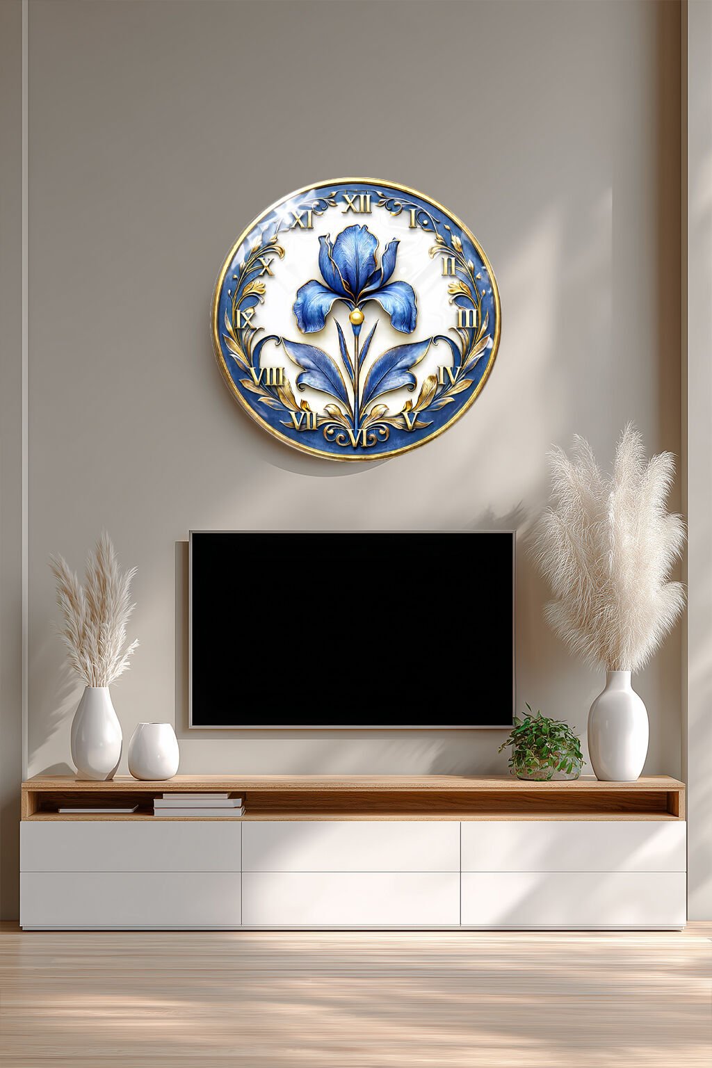 KIRILMAZ CAM DUVAR SAATİ, HEM TABLO HEM SAAT MAVİ İRİS ÇİÇEĞİ KLASİK MOTİF TASARIM EV OFİS HEDİYESİ