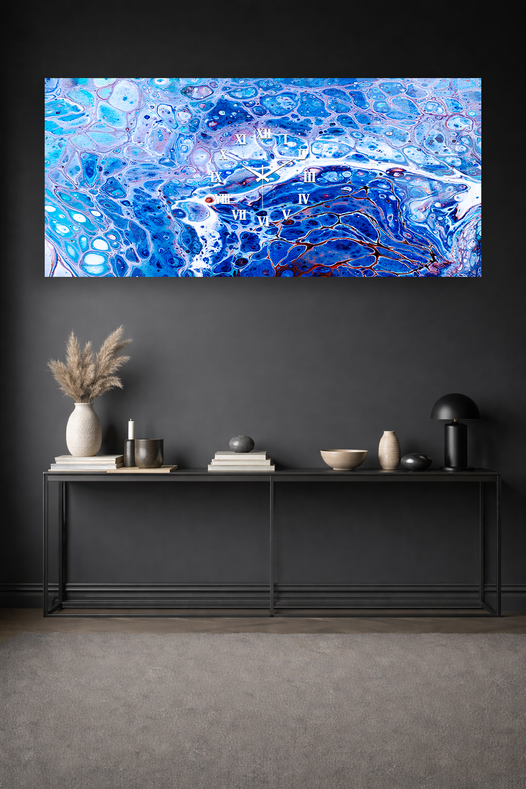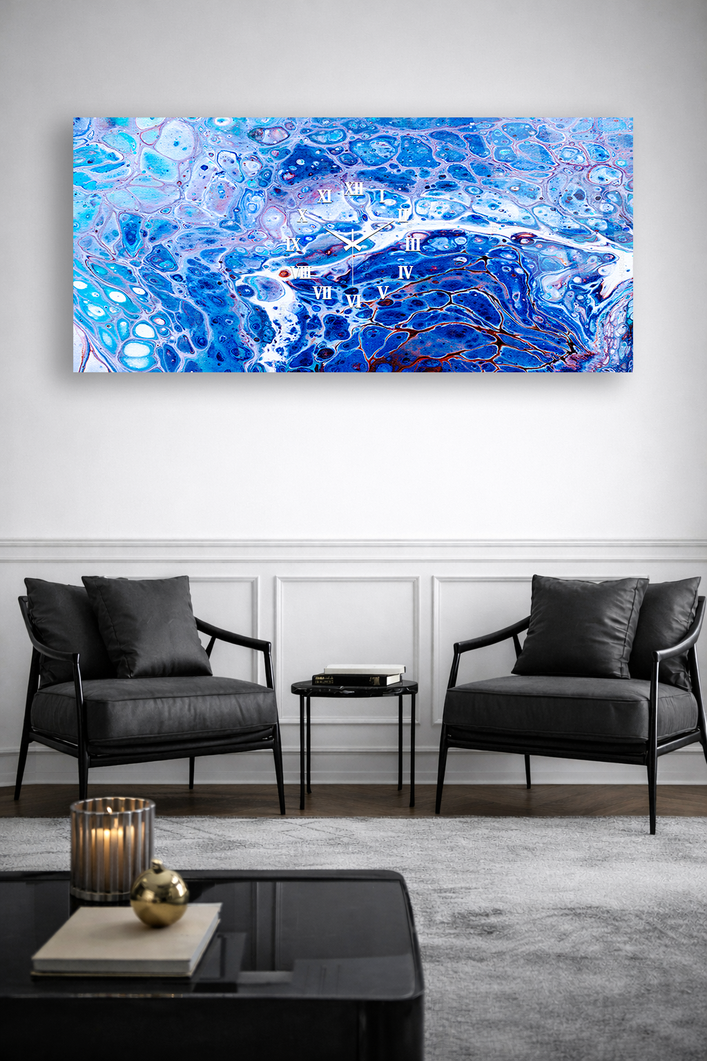 KIRILMAZ CAM DUVAR SAATİ , HEM TABLO HEM SAAT MAVİ MERMER SOYUT DESEN EV OFİS HEDİYESİ