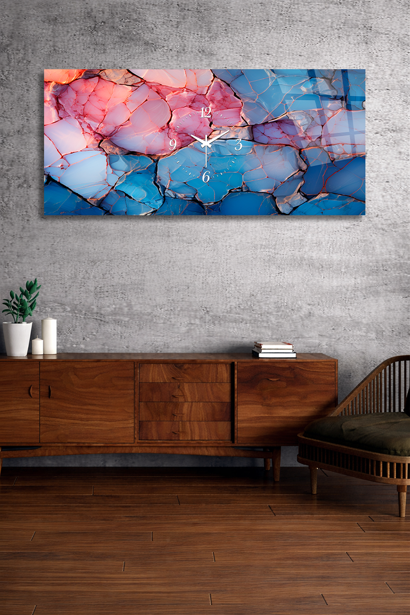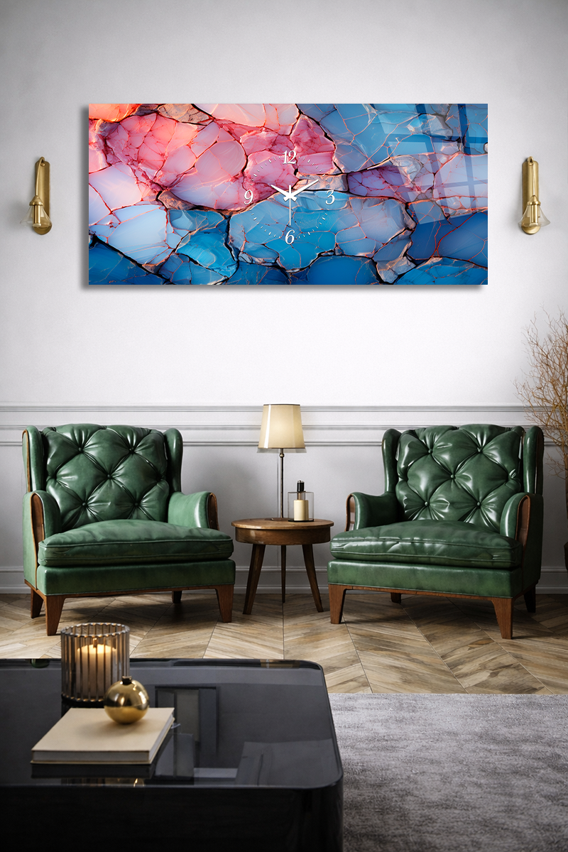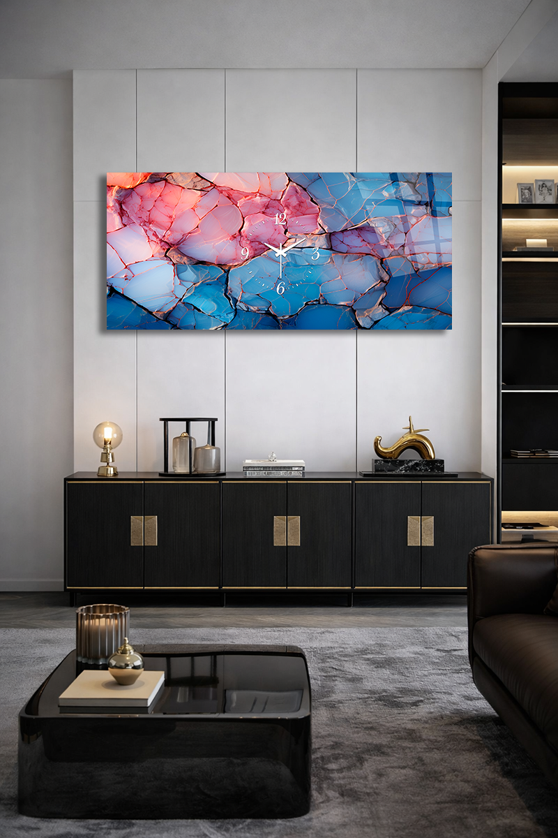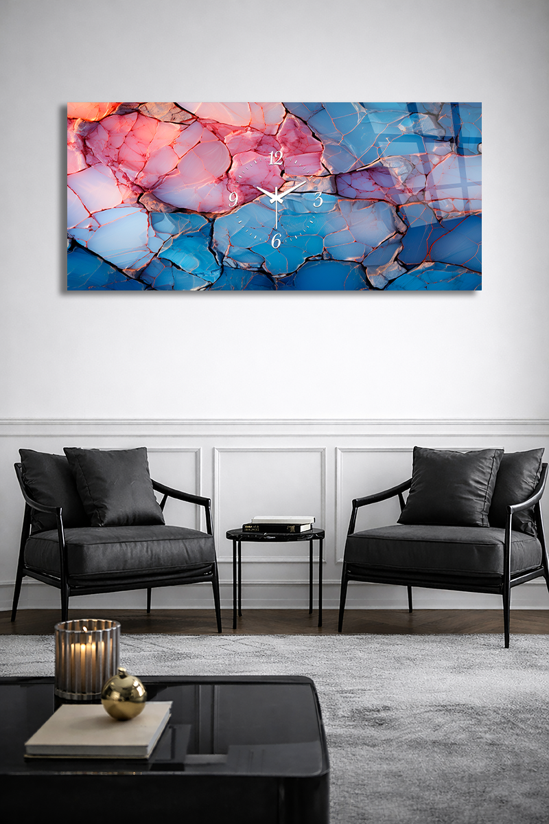 KIRILMAZ CAM DUVAR SAATİ , HEM TABLO HEM SAAT MAVİ PEMBE MERMER SANATSAL EV OFİS HEDİYESİ