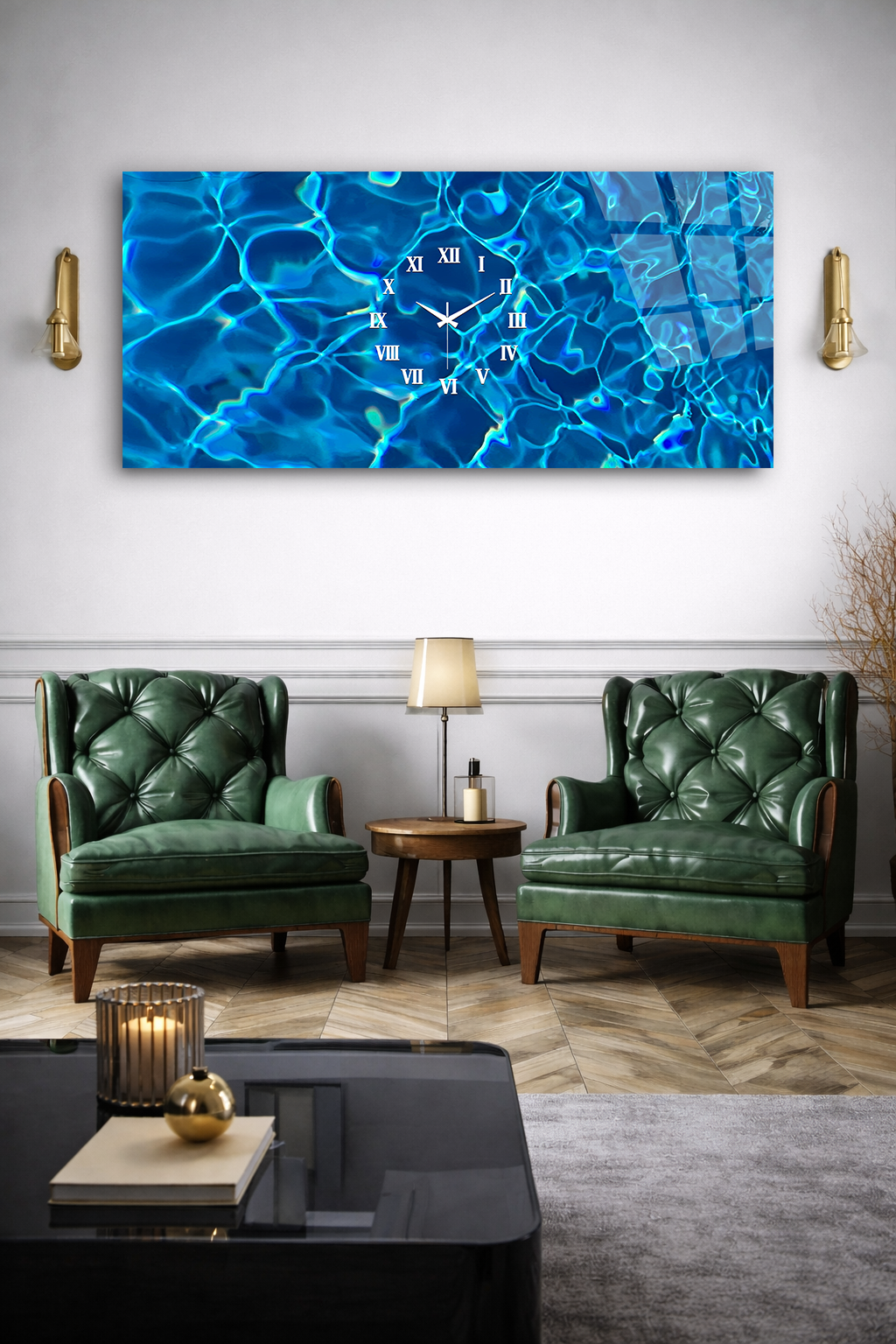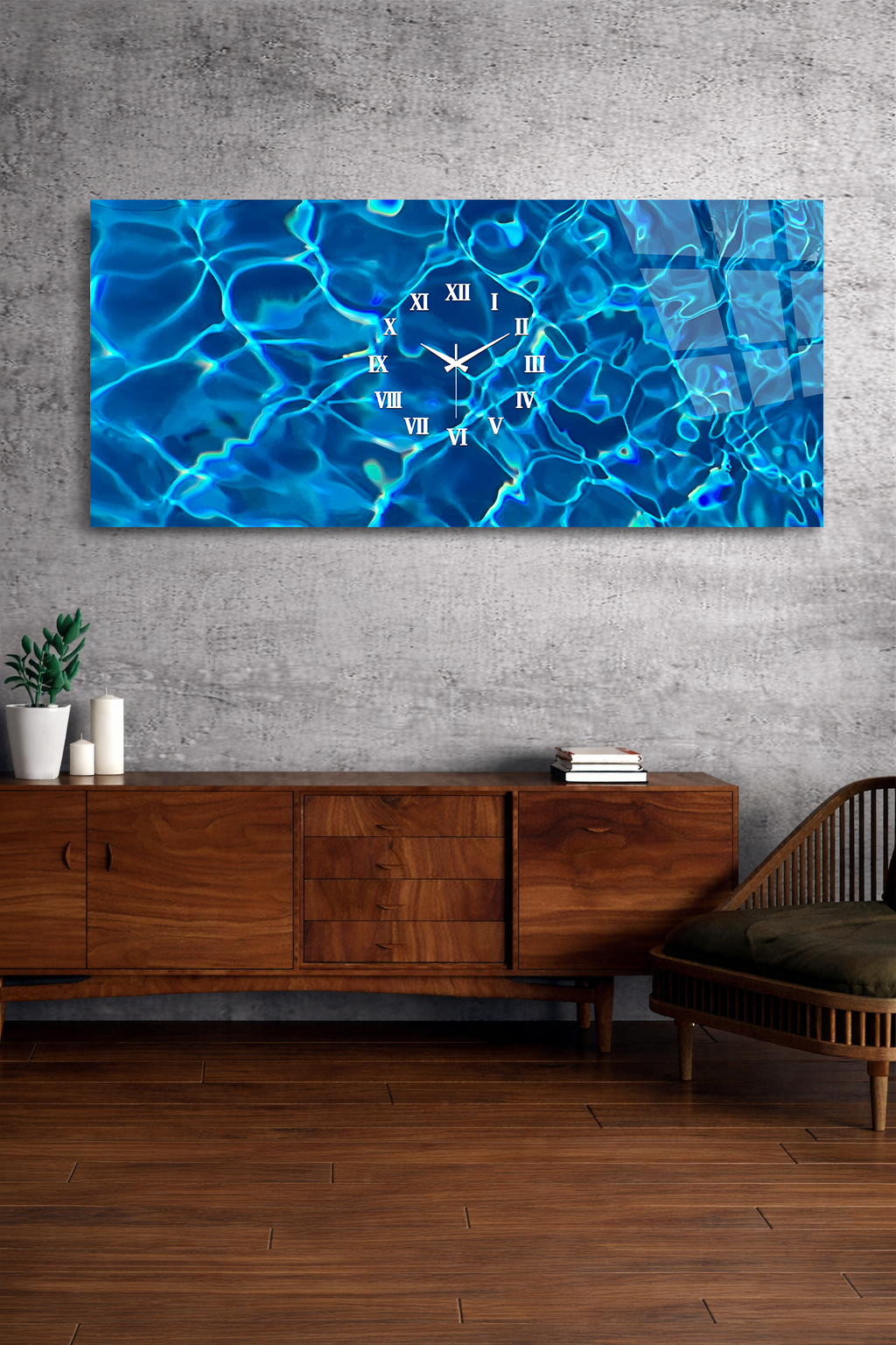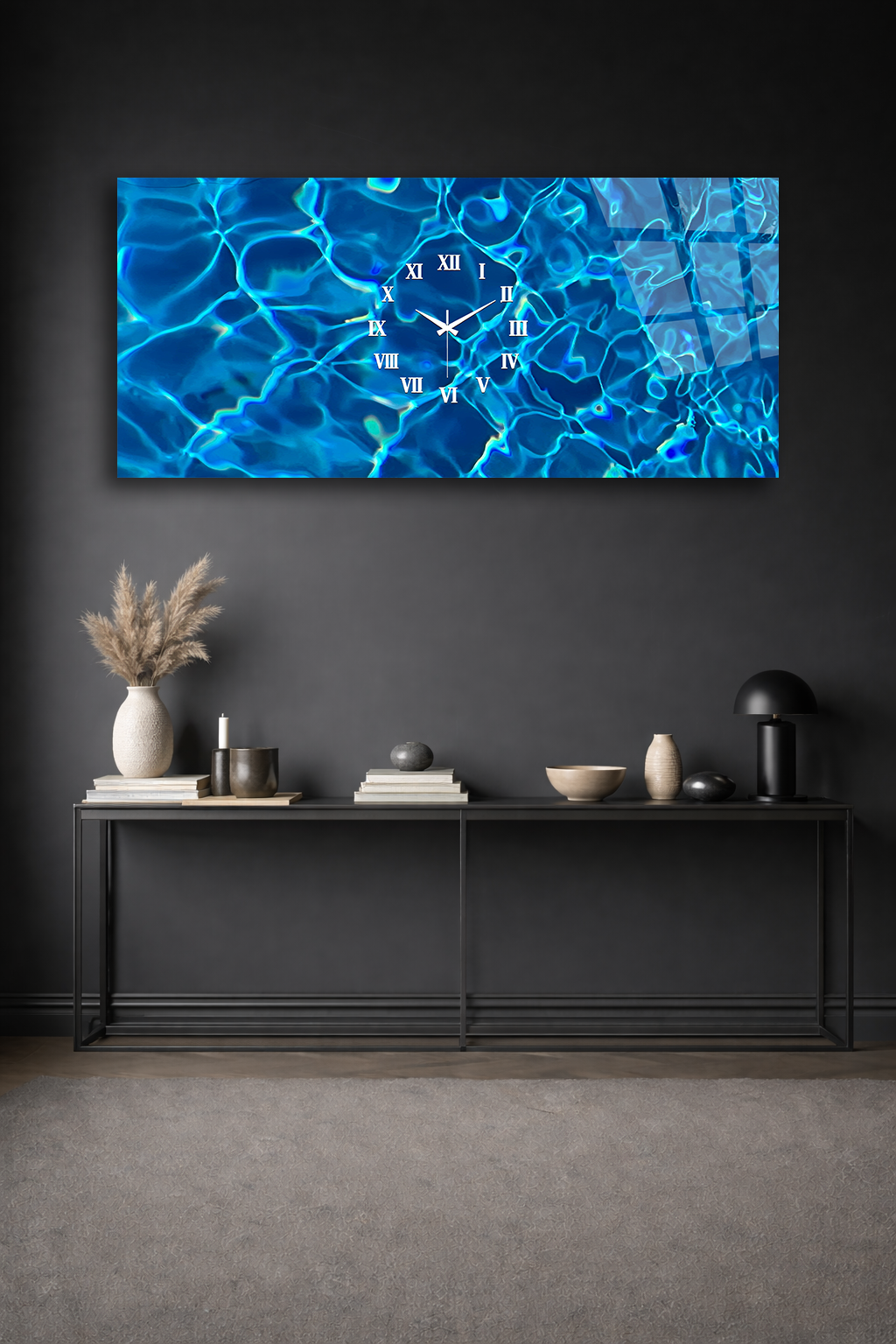 KIRILMAZ CAM DUVAR SAATİ , HEM TABLO HEM SAAT MAVİ SU DALGA DESENLİ MODERN EV OFİS HEDİYESİ