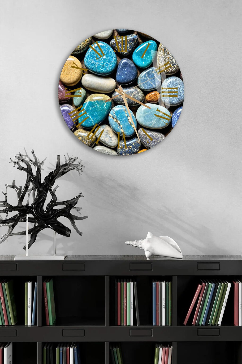 KIRILMAZ CAM DUVAR SAATİ, HEM TABLO HEM SAAT MAVİ TONLU DOĞAL TAŞ ZEN TASARIM EV OFİS HEDİYESİ