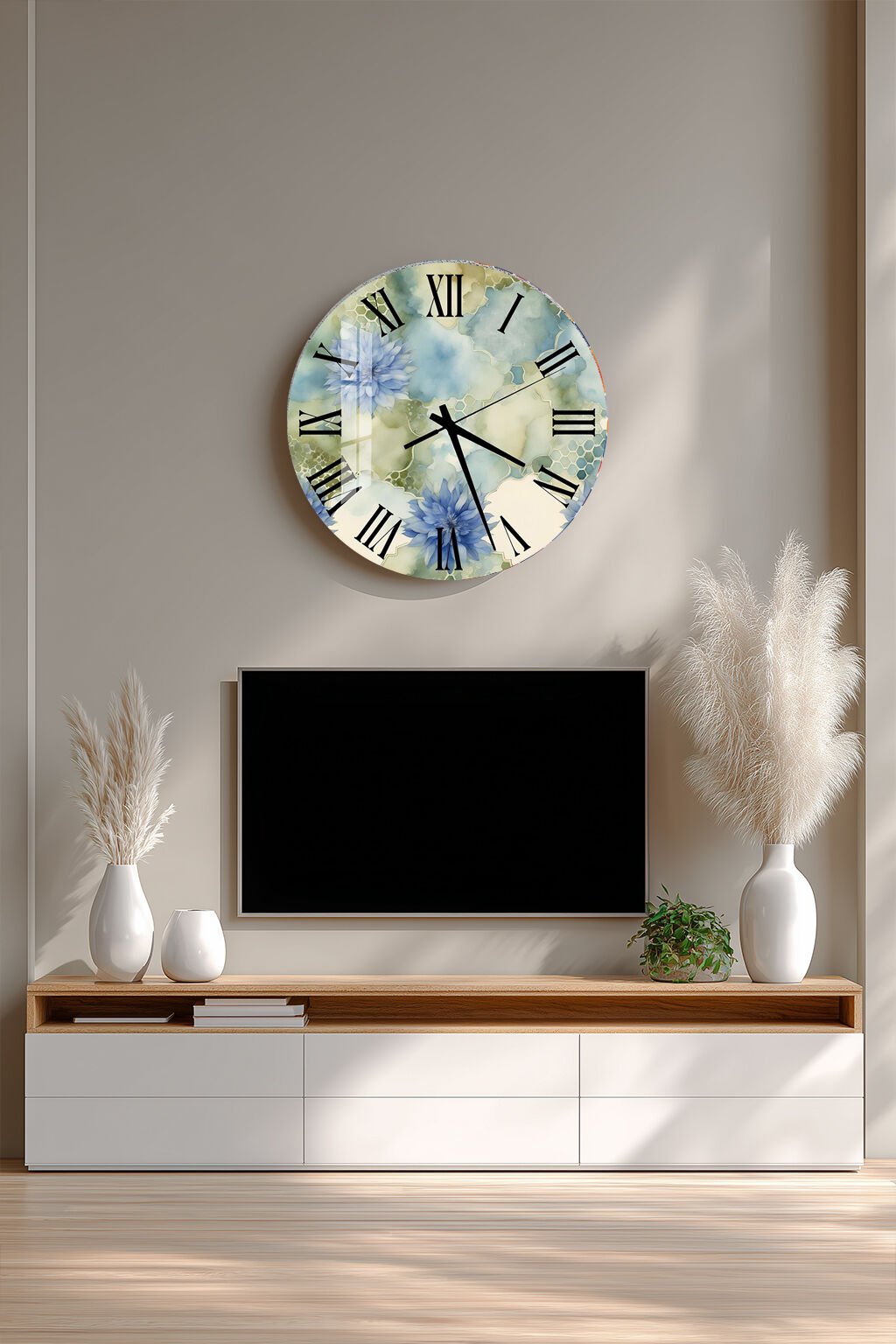 KIRILMAZ CAM DUVAR SAATİ, HEM TABLO HEM SAAT MAVİ YEŞİL ÇİÇEKLİ BOHO DESEN EV OFİS HEDİYESİ