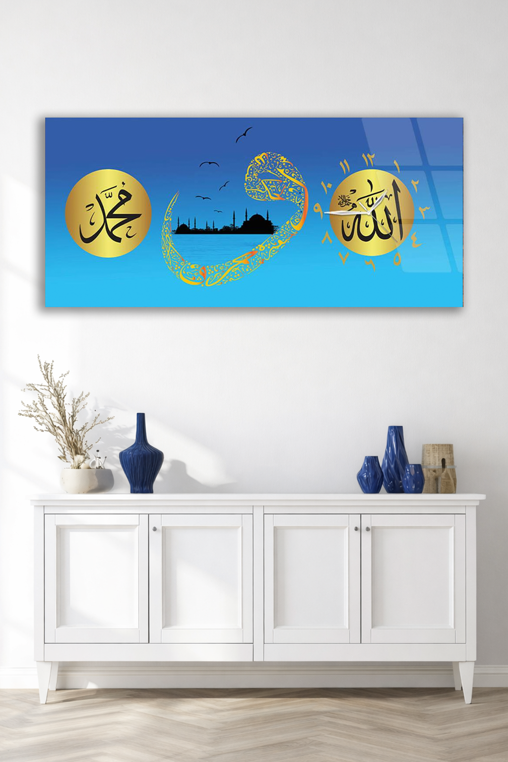 KIRILMAZ CAM DUVAR SAATİ , HEM TABLO HEM SAAT MAVİ ZEMİN ALLAH MUHAMMED TEMALI EV OFİS HEDİYESİ