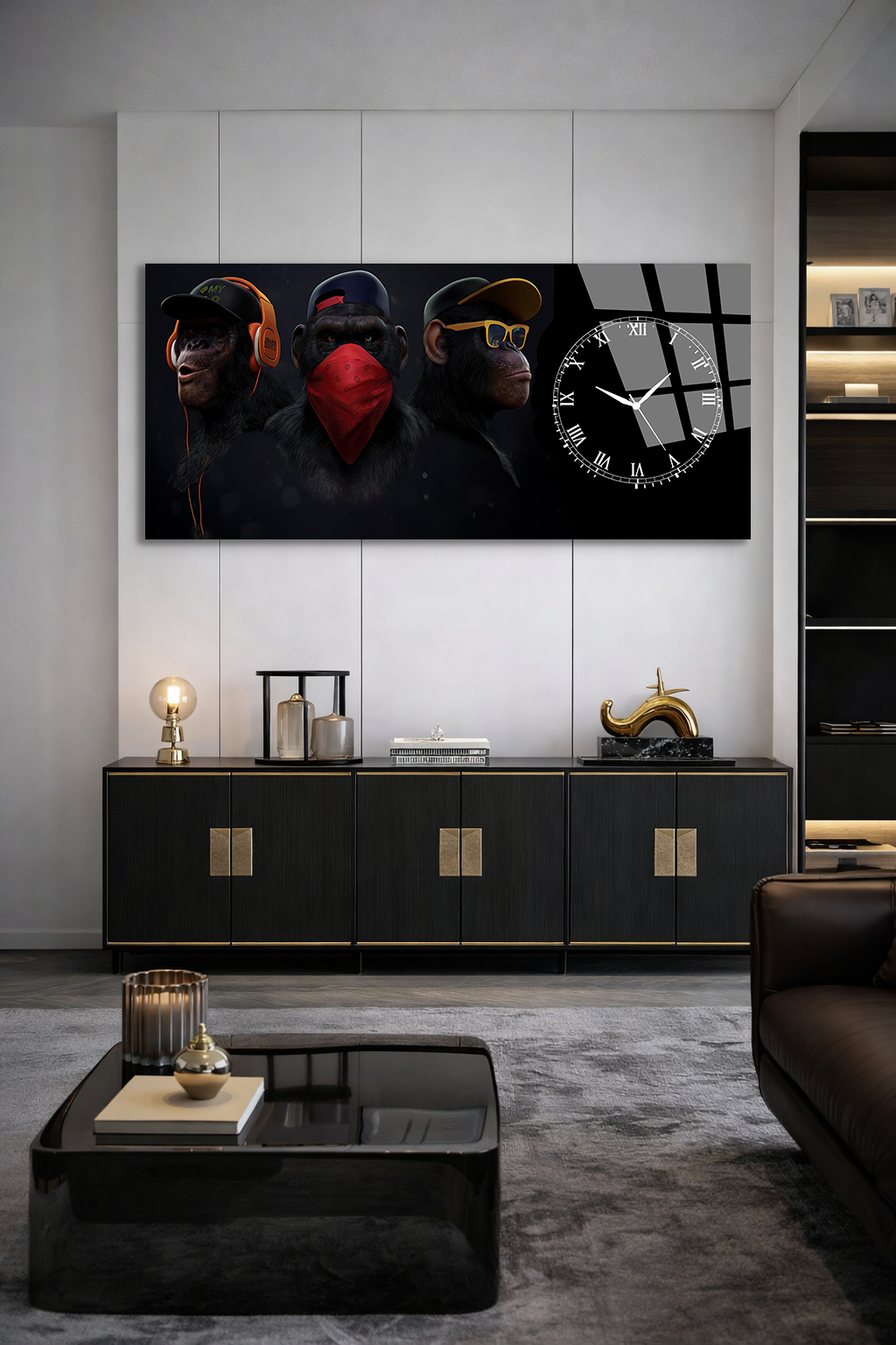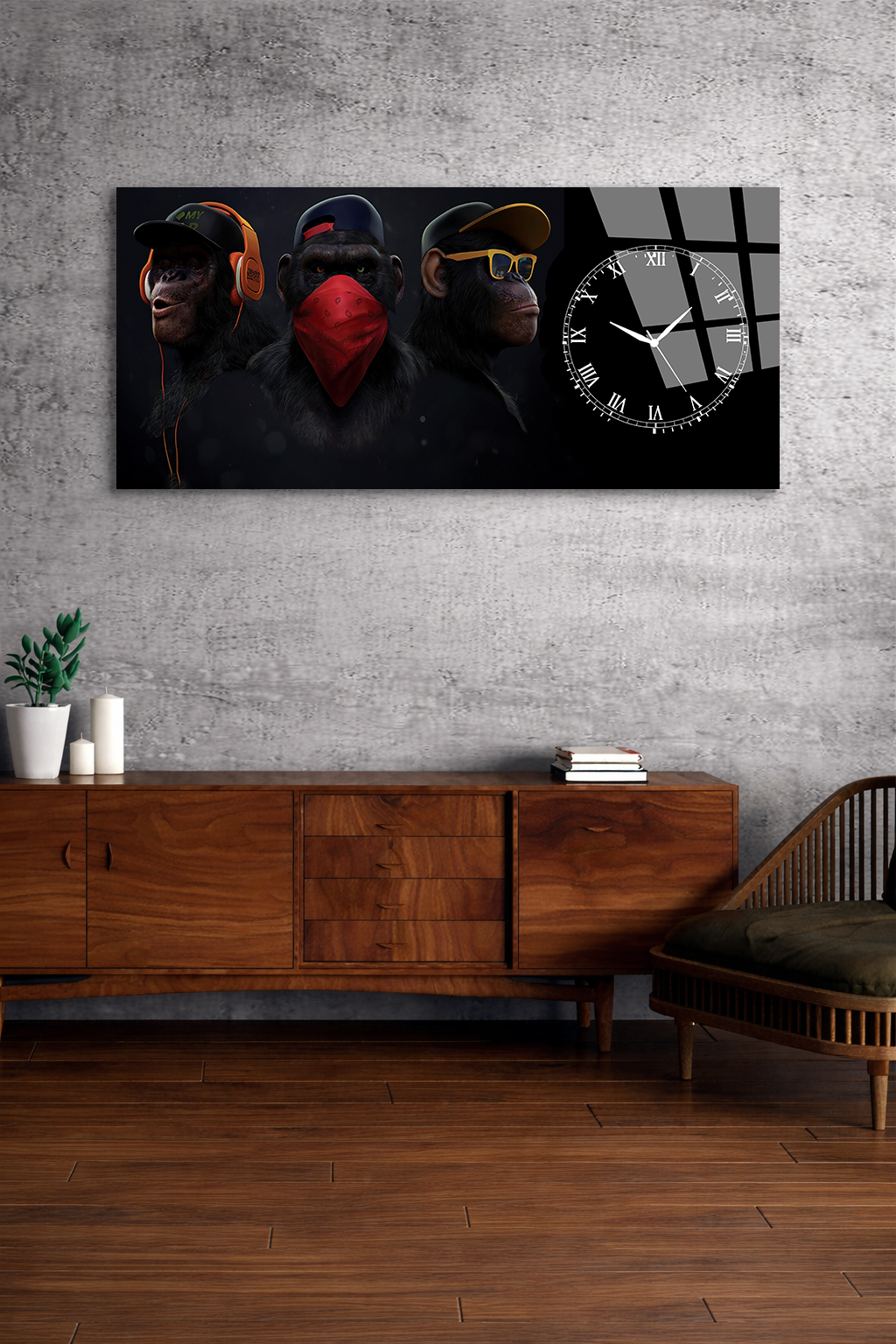 KIRILMAZ CAM DUVAR SAATİ , HEM TABLO HEM SAAT MODERN MAYMUN ÜÇLÜ TASARIM EV OFİS HEDİYESİ