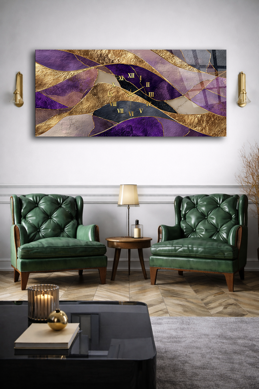KIRILMAZ CAM DUVAR SAATİ , HEM TABLO HEM SAAT MOR ALTIN SOYUT DESEN LÜKS TASARIM EV OFİS HEDİYESİ