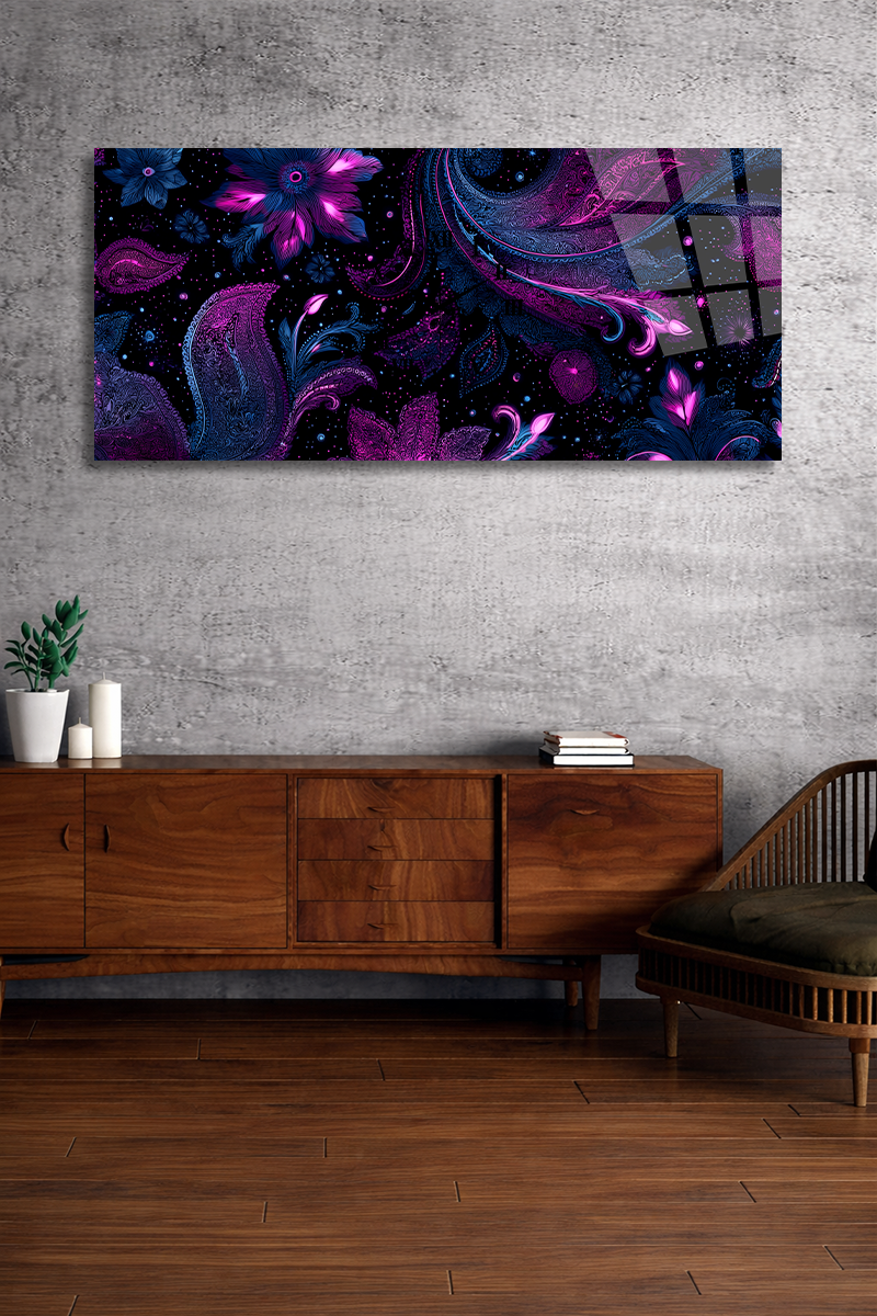 KIRILMAZ CAM DUVAR SAATİ , HEM TABLO HEM SAAT MOR ÇİÇEKLİ MODERN TASARIM EV OFİS HEDİYESİ