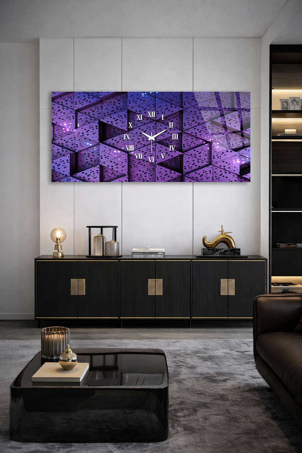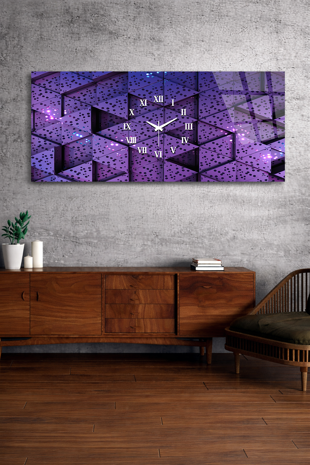 KIRILMAZ CAM DUVAR SAATİ , HEM TABLO HEM SAAT MOR GEOMETRİK IŞIK DESEN TASARIM EV OFİS HEDİYESİ