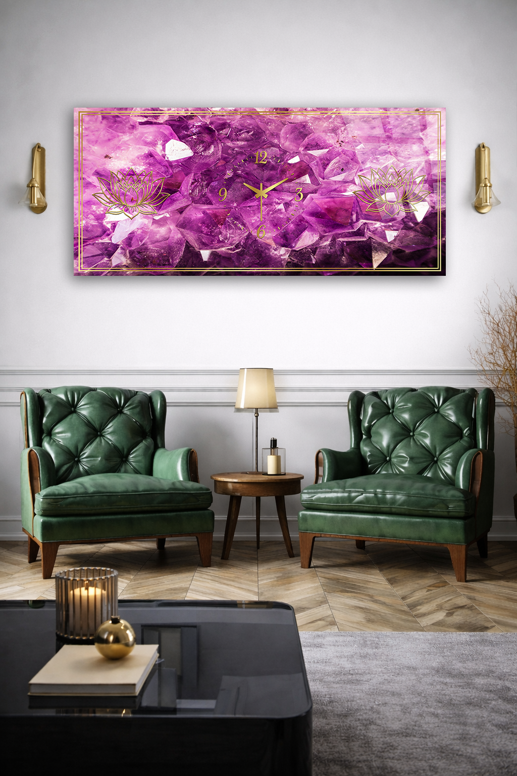 KIRILMAZ CAM DUVAR SAATİ , HEM TABLO HEM SAAT MOR KRİSTAL LOTUS DESEN EV OFİS HEDİYESİ