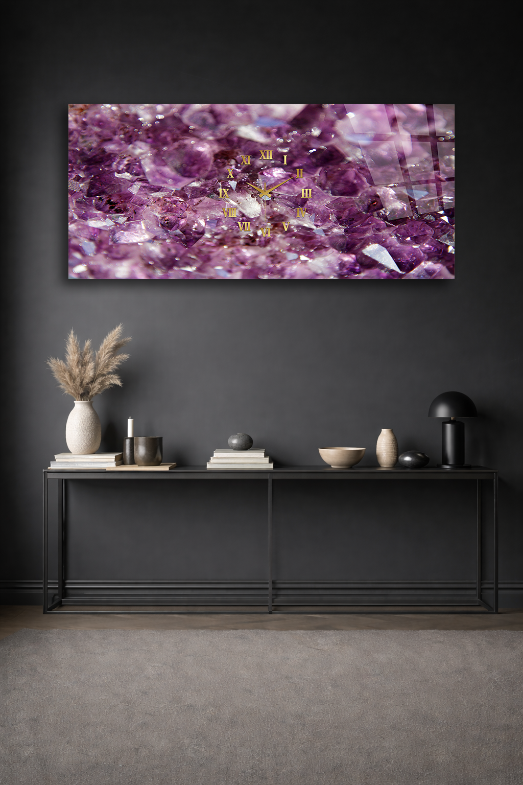 KIRILMAZ CAM DUVAR SAATİ , HEM TABLO HEM SAAT MOR KRİSTAL TAŞ DOKULU LÜKS TASARIM EV OFİS HEDİYESİ