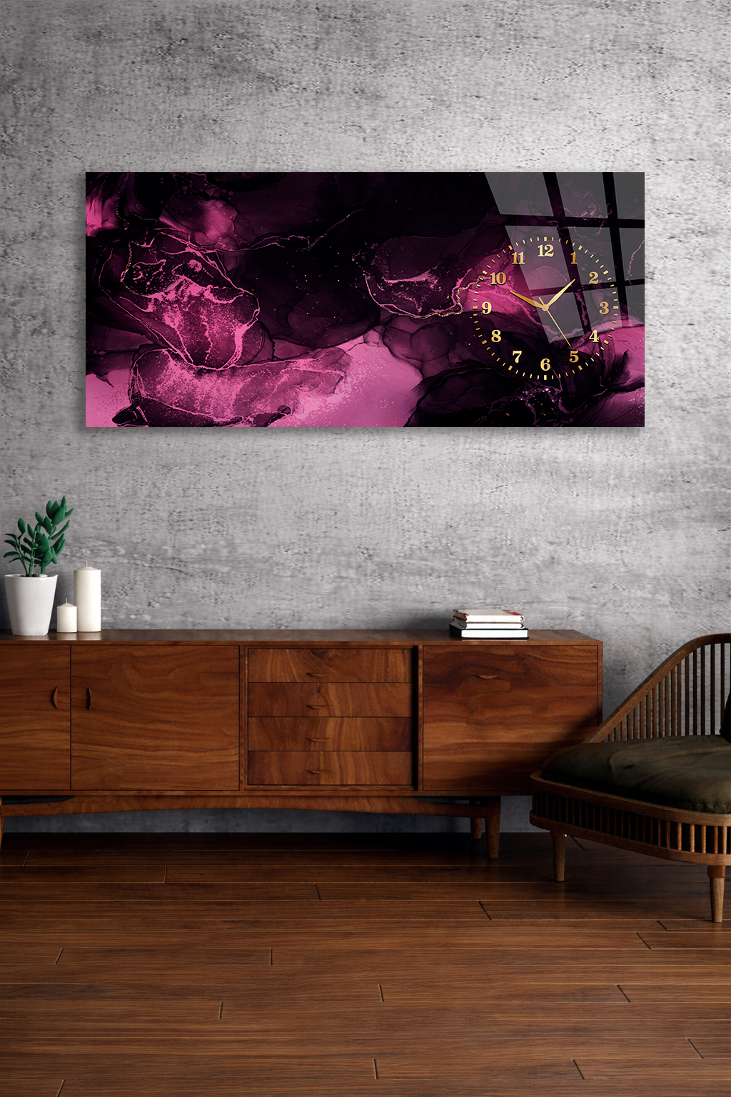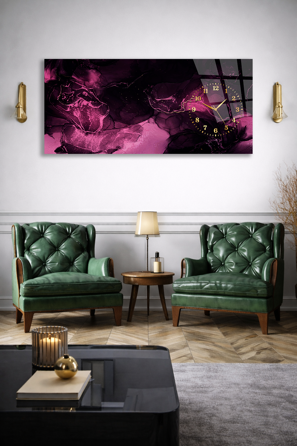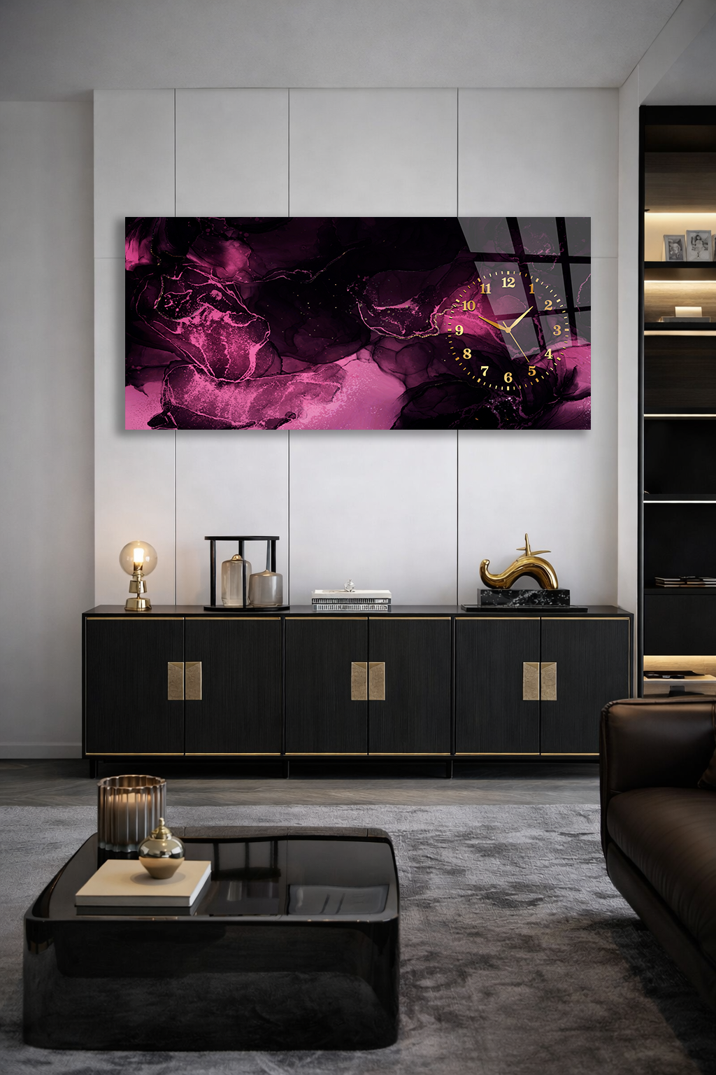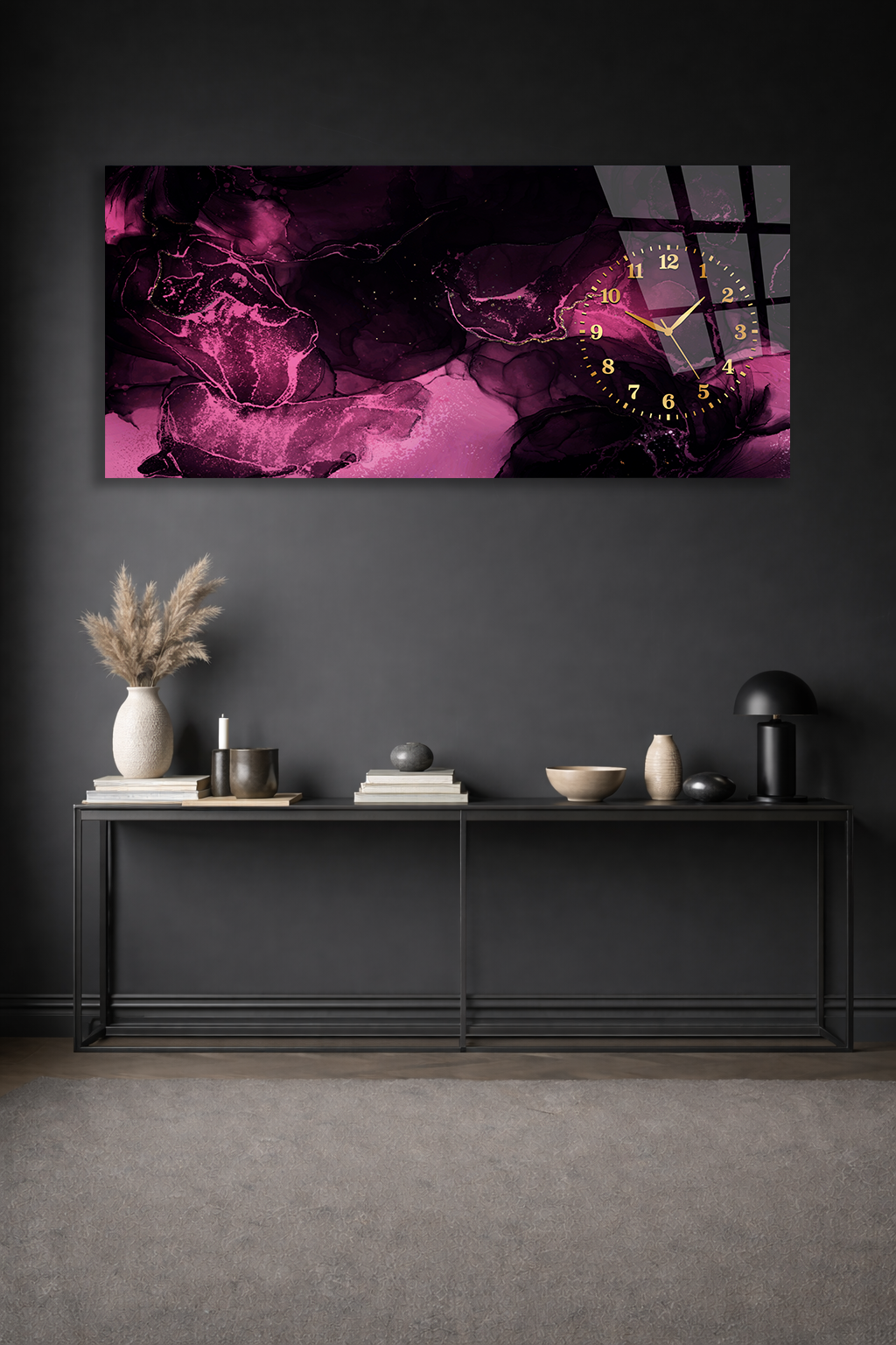 KIRILMAZ CAM DUVAR SAATİ , HEM TABLO HEM SAAT MOR MERMER ALTIN SAAT DETAYLI TASARIM EV OFİS HEDİYESİ