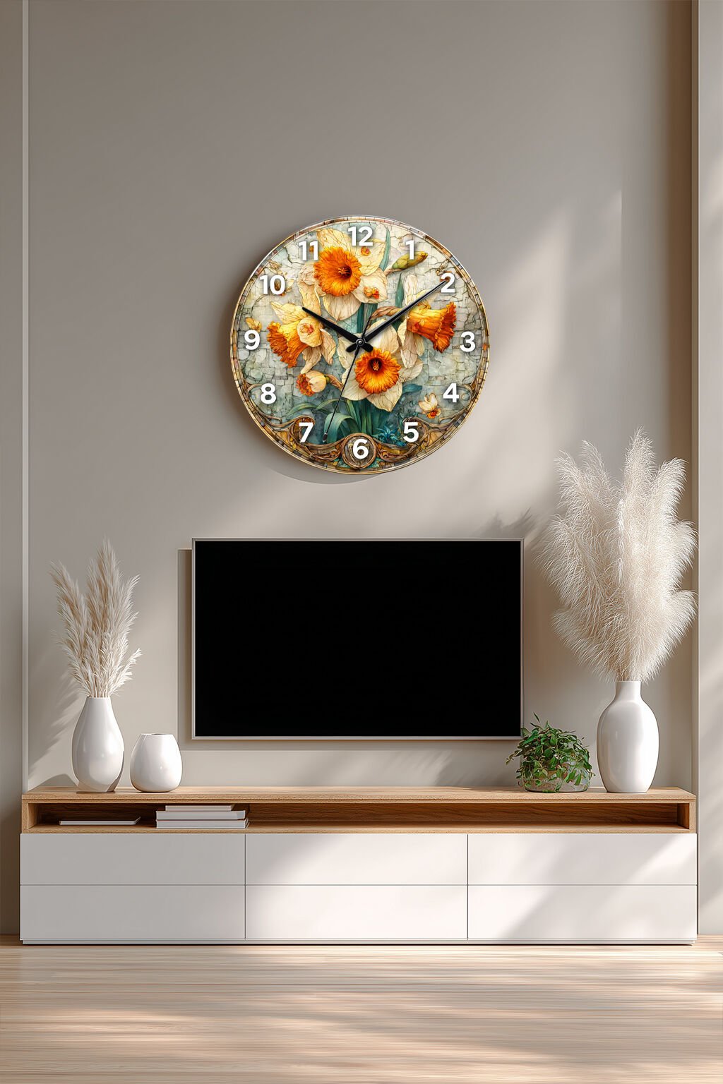 KIRILMAZ CAM DUVAR SAATİ, HEM TABLO HEM SAAT NARSİS ÇİÇEKLERİ VİNTAGE ÇİÇEK DESENİ EV OFİS HEDİYESİ