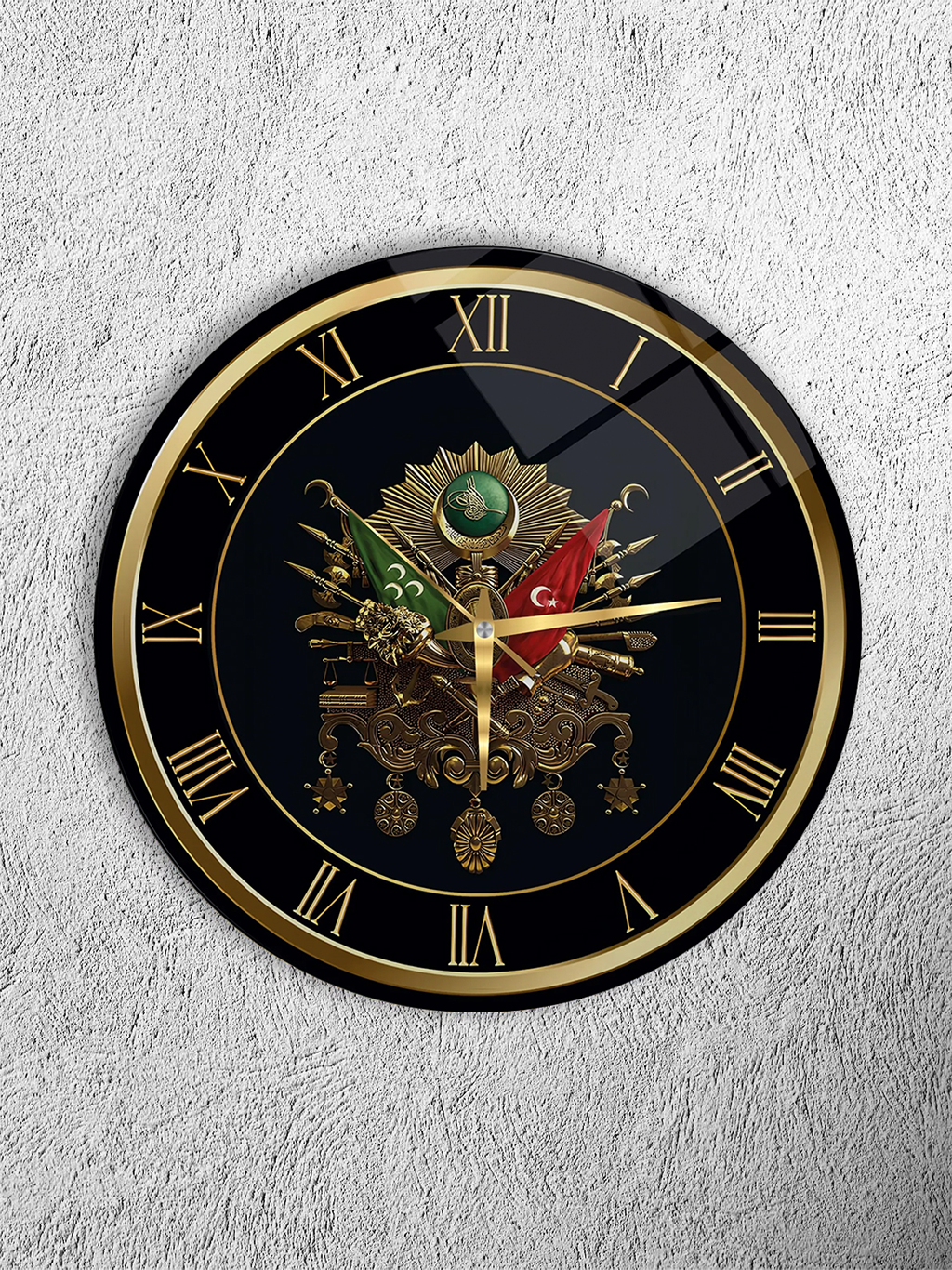 KIRILMAZ CAM DUVAR SAATİ,HEM TABLO HEM SAAT OSMANLI ARMASI ALTIN DETAYLI KLASİK TARZ SAAT EV OFİS HEDİYESİ