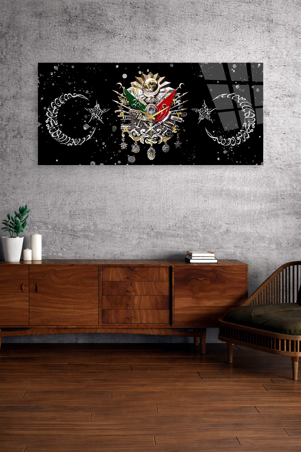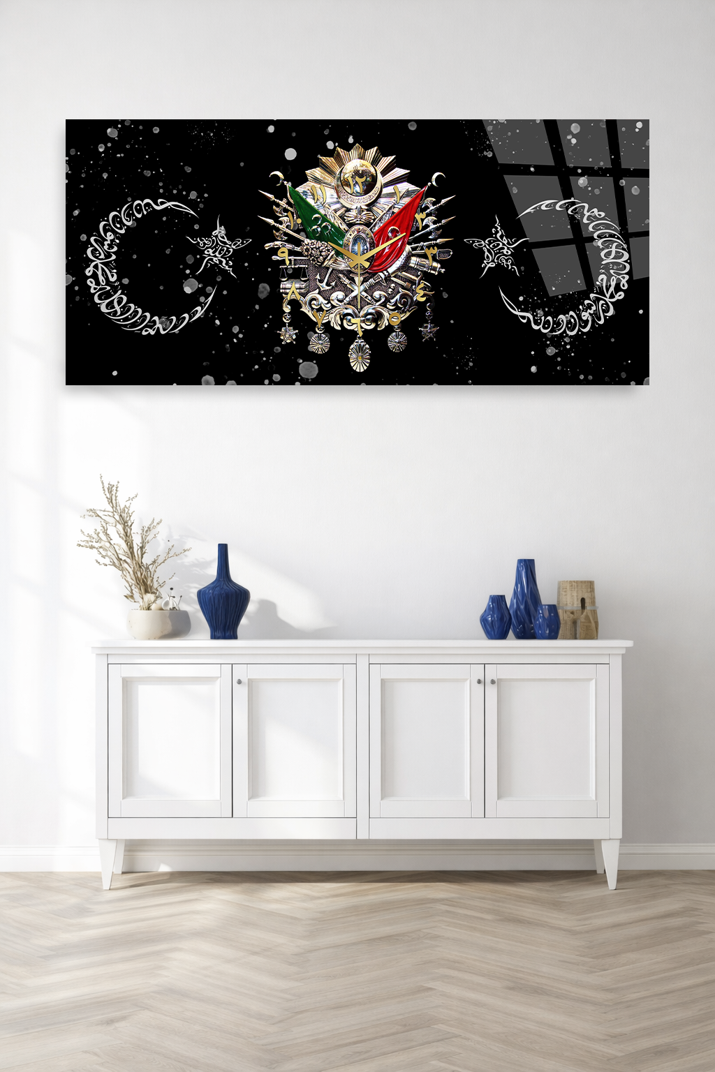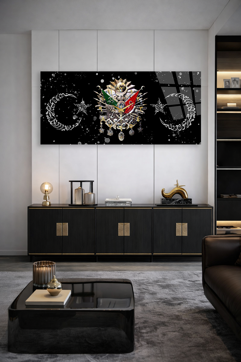 KIRILMAZ CAM DUVAR SAATİ , HEM TABLO HEM SAAT OSMANLI ARMASI SİYAH ZEMİN LÜKS EV OFİS HEDİYESİ