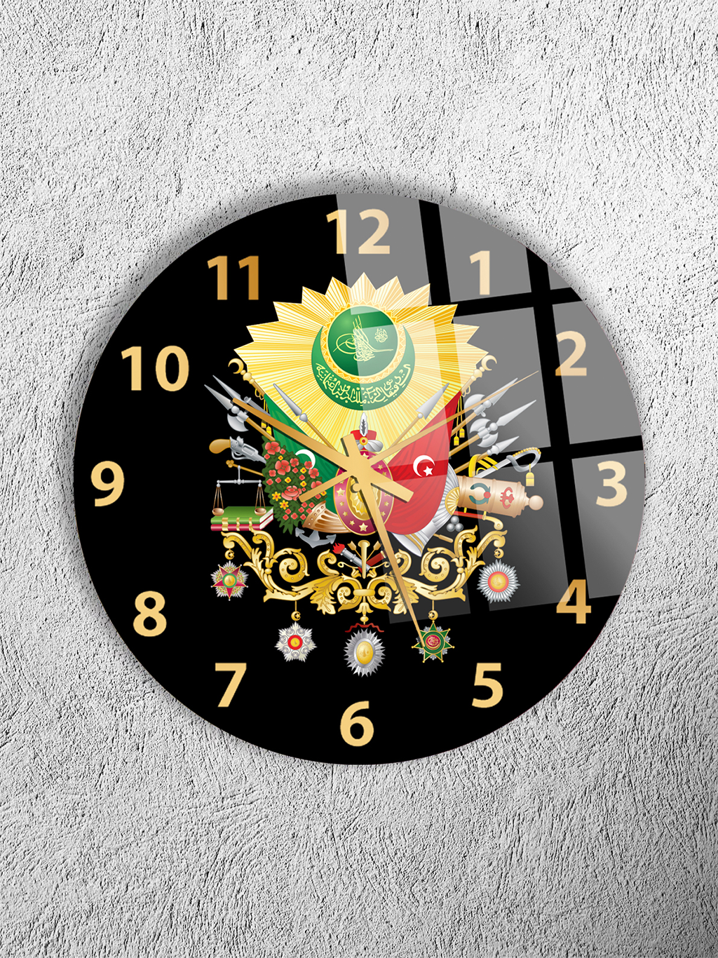 KIRILMAZ CAM DUVAR SAATİ, HEM TABLO HEM SAAT OSMANLI ARMASI TEMALI KLASİK TASARIM EV OFİS HEDİYESİ