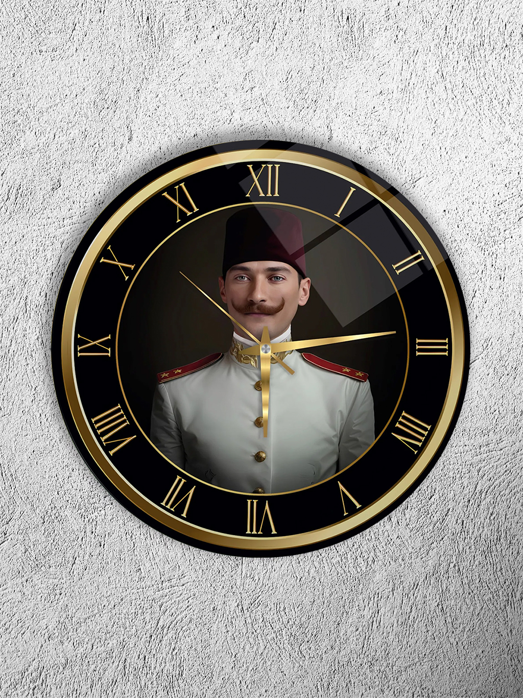 KIRILMAZ CAM DUVAR SAATİ, HEM TABLO HEM SAAT OSMANLI SUBAY PORTRESİ KLASİK SİYAH ALTIN ÇERÇEVE TASARIM EV OFİS HEDİYESİ