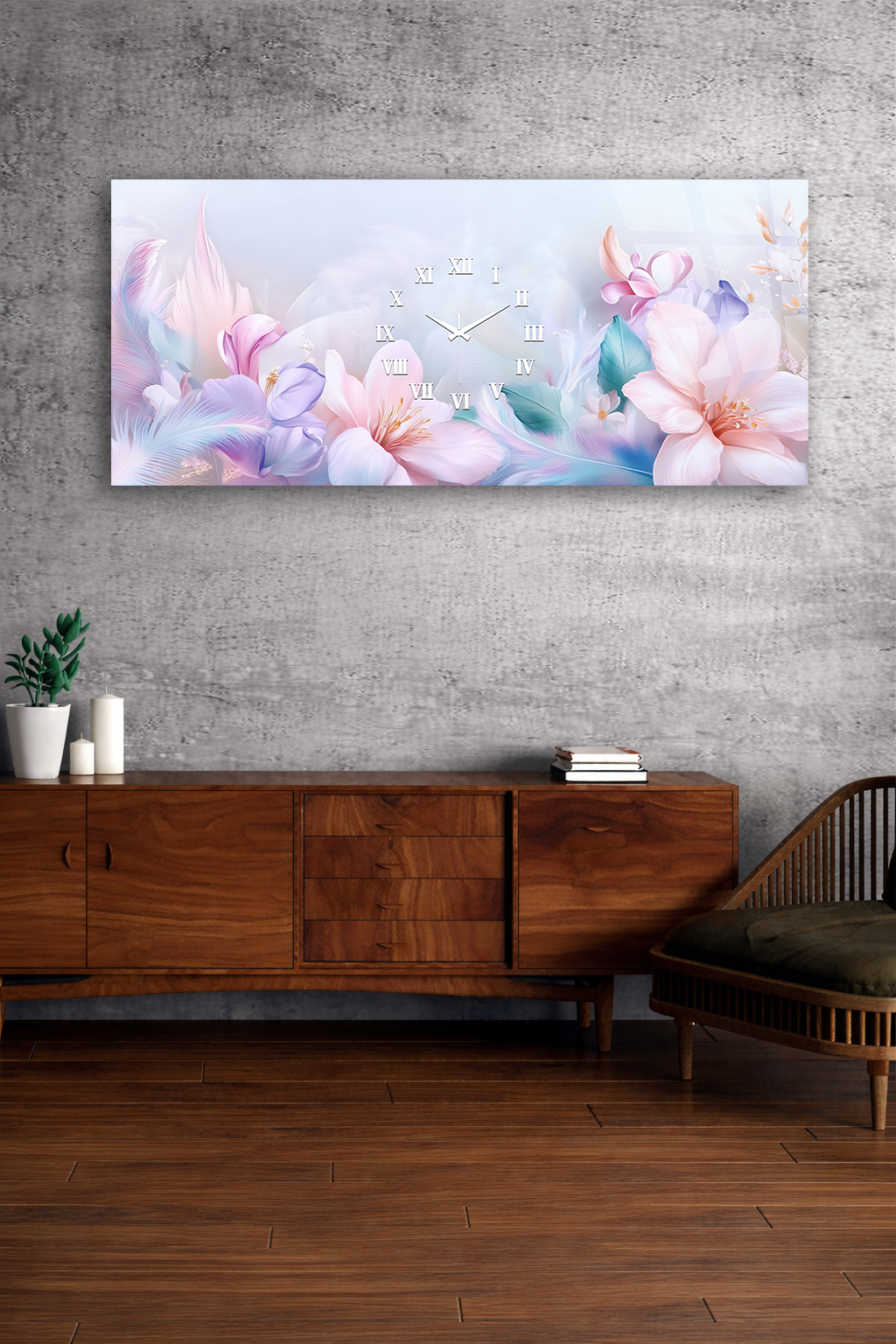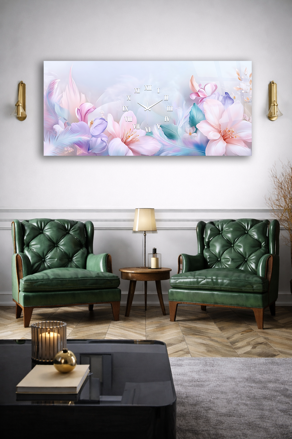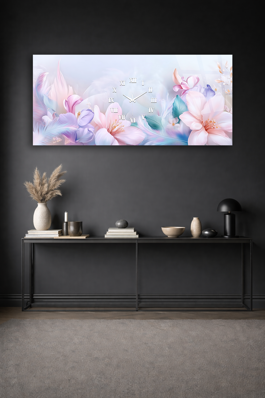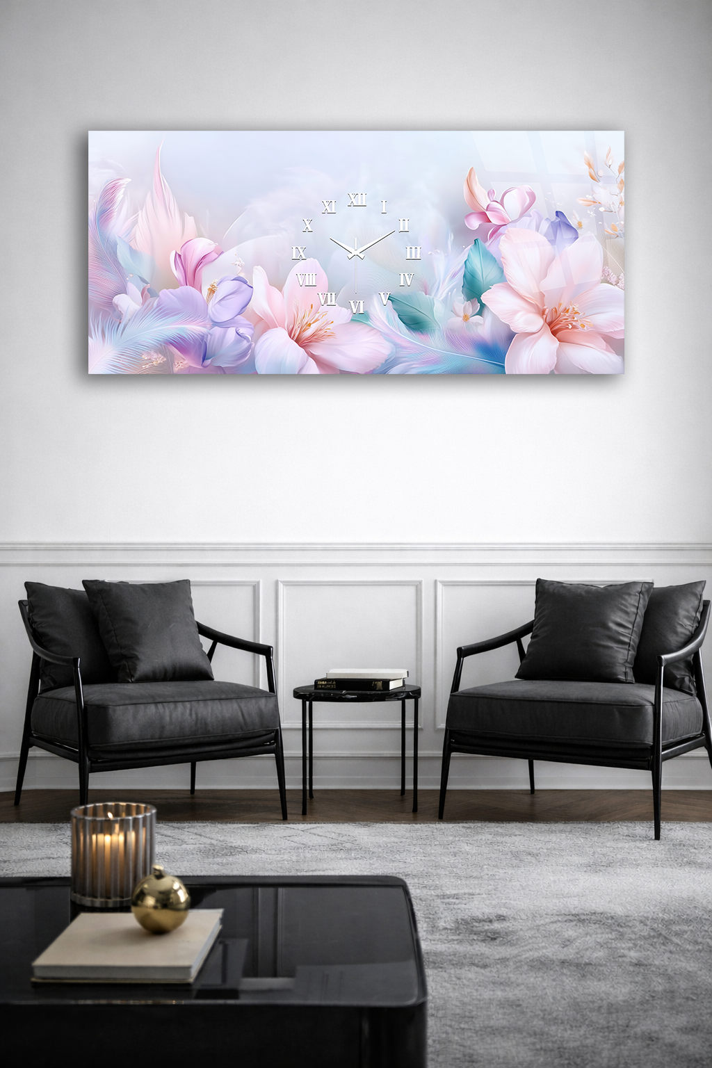 KIRILMAZ CAM DUVAR SAATİ , HEM TABLO HEM SAAT PASTEL ÇİÇEKLİ ROMANTİK TASARIM EV OFİS HEDİYESİ