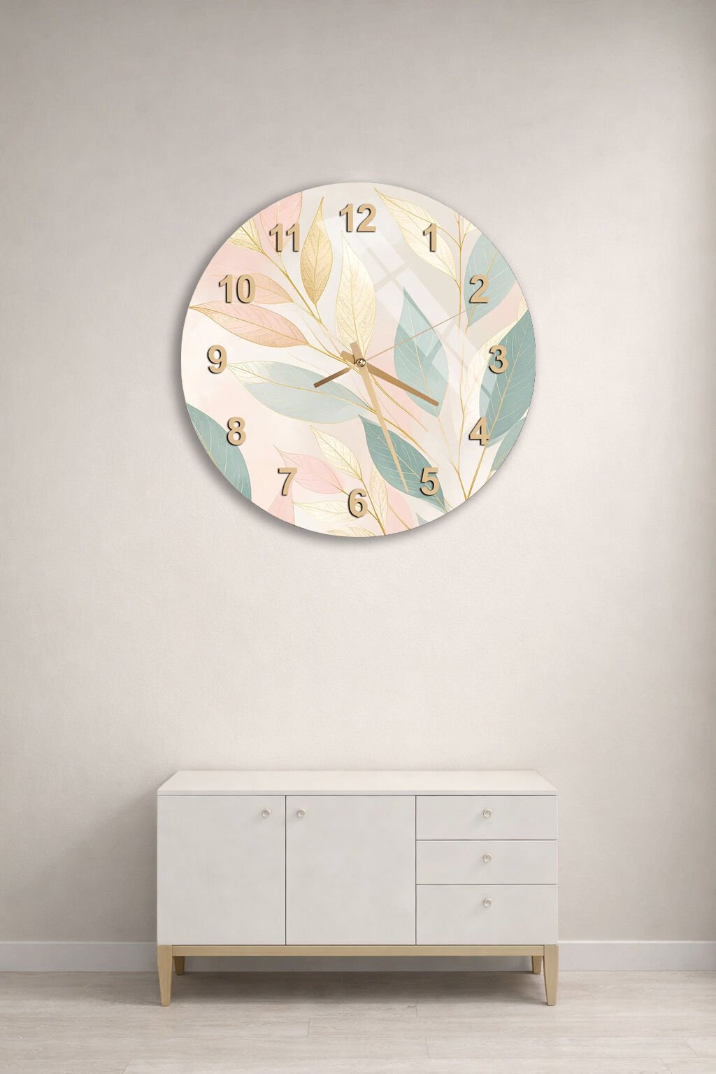 KIRILMAZ CAM DUVAR SAATİ, HEM TABLO HEM SAAT PASTEL YAPRAK DESEN ZARİF EV OFİS HEDİYESİ