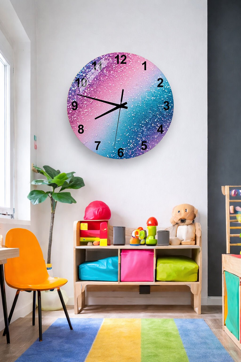 KIRILMAZ CAM DUVAR SAATİ, HEM TABLO HEM SAAT PEMBE MAVİ GALAKSİ PARÇACIK DESEN EV OFİS HEDİYESİ