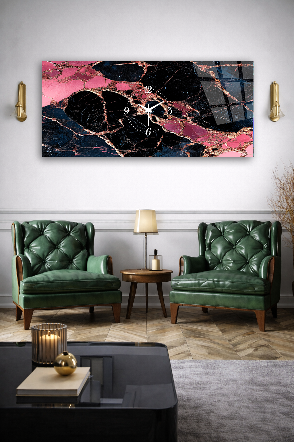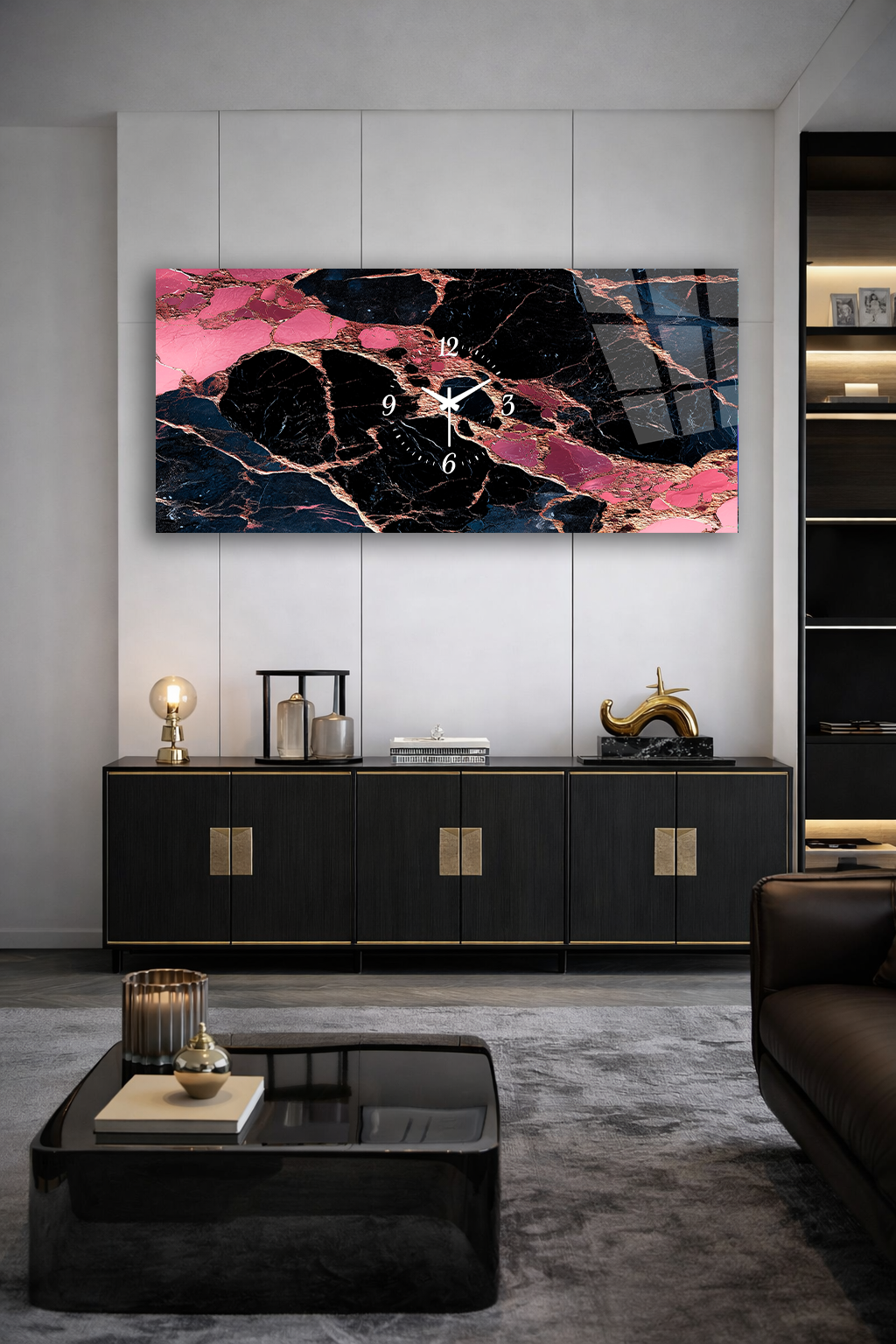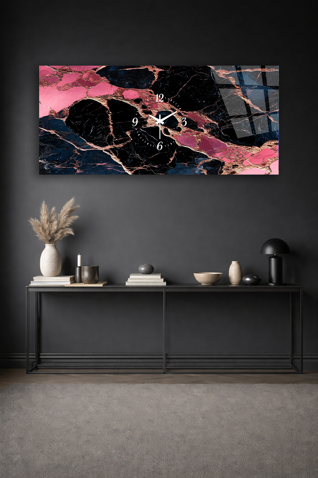 KIRILMAZ CAM DUVAR SAATİ , HEM TABLO HEM SAAT PEMBE SİYAH MERMER DESEN MODERN EV OFİS HEDİYESİ