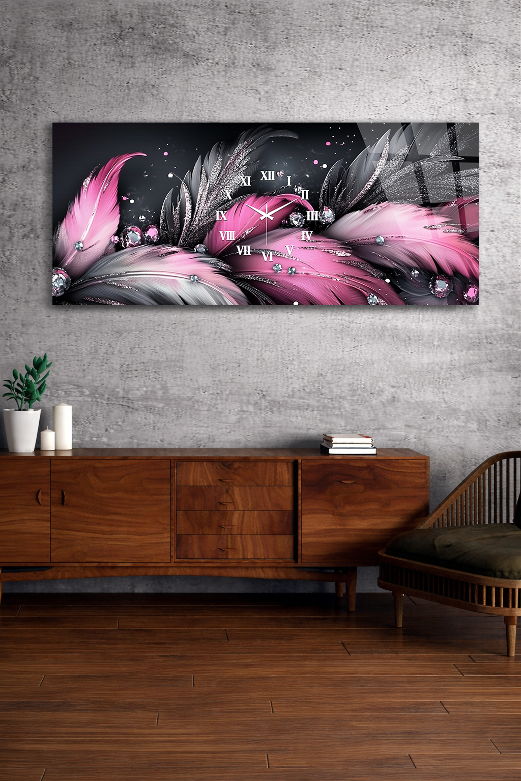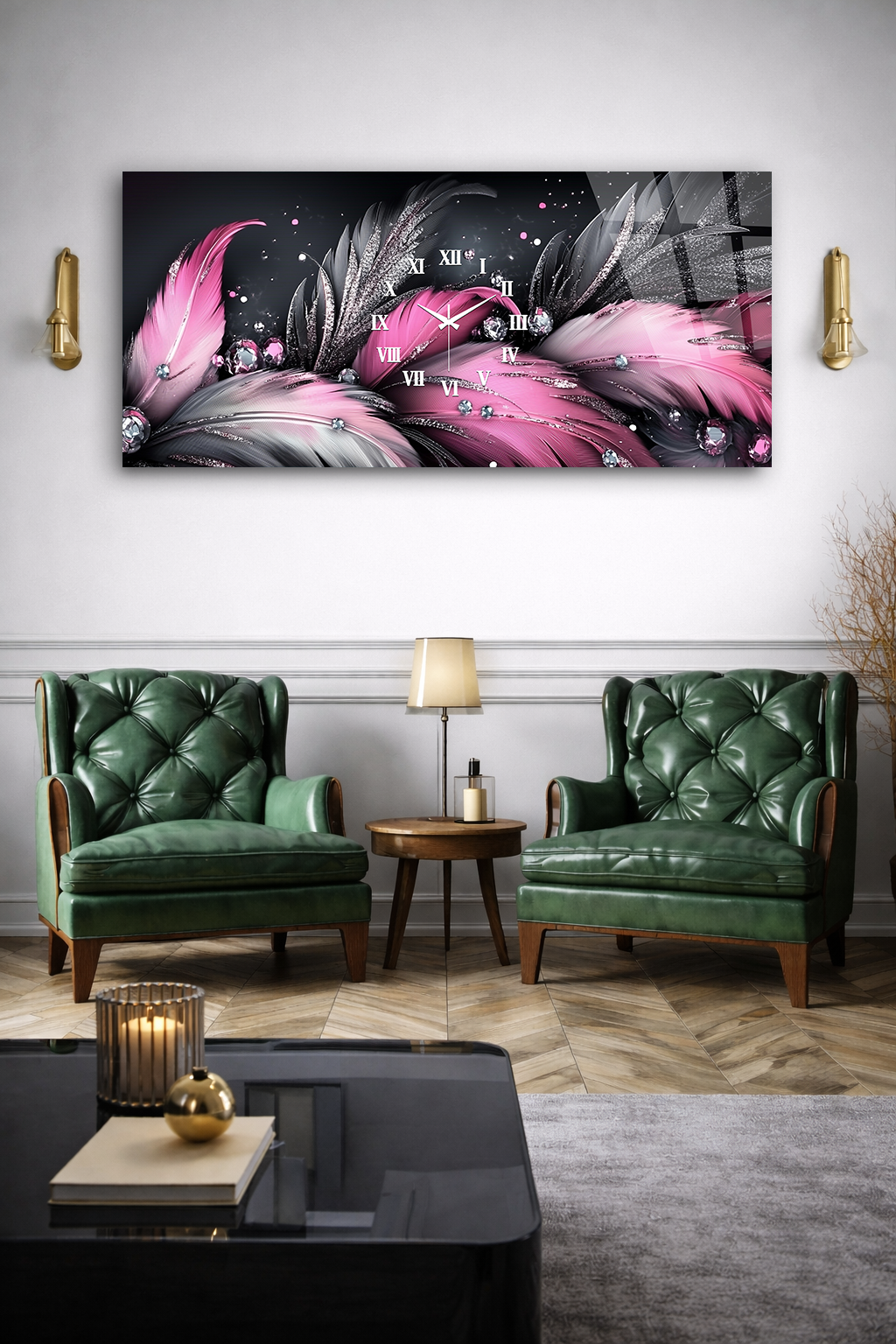 KIRILMAZ CAM DUVAR SAATİ , HEM TABLO HEM SAAT PEMBE TÜY VE TAŞ DETAYLI TASARIM EV OFİS HEDİYESİ