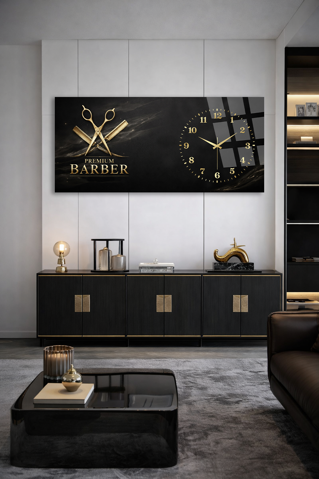 KIRILMAZ CAM DUVAR SAATİ , HEM TABLO HEM SAAT PREMIUM BARBER GOLD SİYAH TASARIM EV OFİS HEDİYESİ