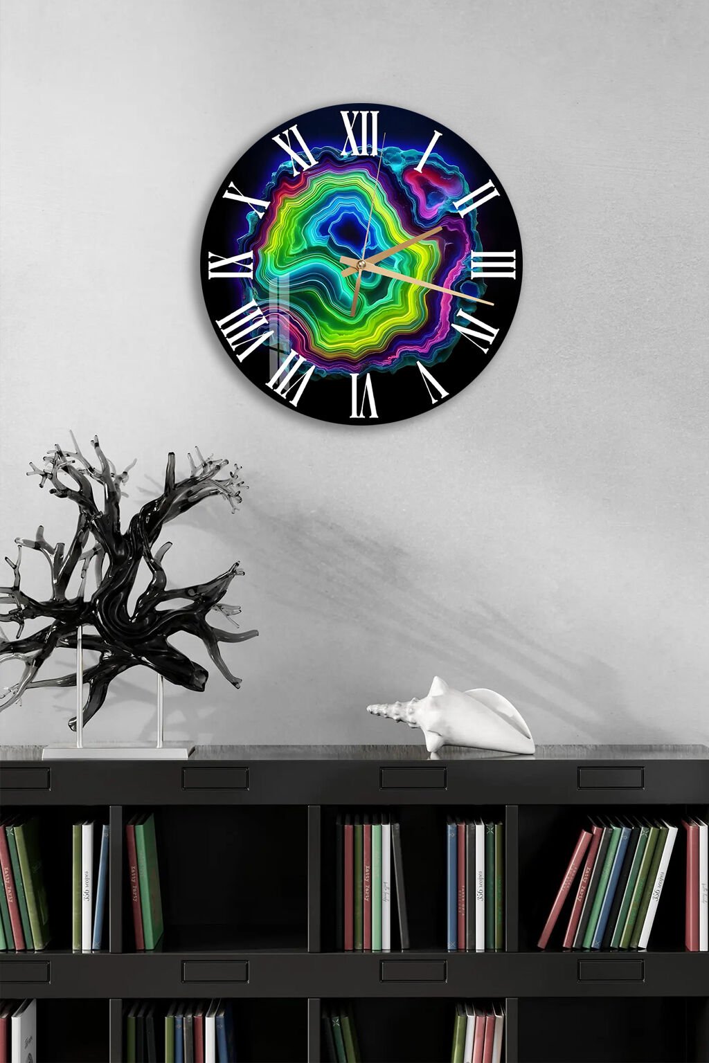 KIRILMAZ CAM DUVAR SAATİ, HEM TABLO HEM SAAT RENKLİ AKİK TAŞ SOYUT LÜKS TASARIM EV OFİS HEDİYESİ