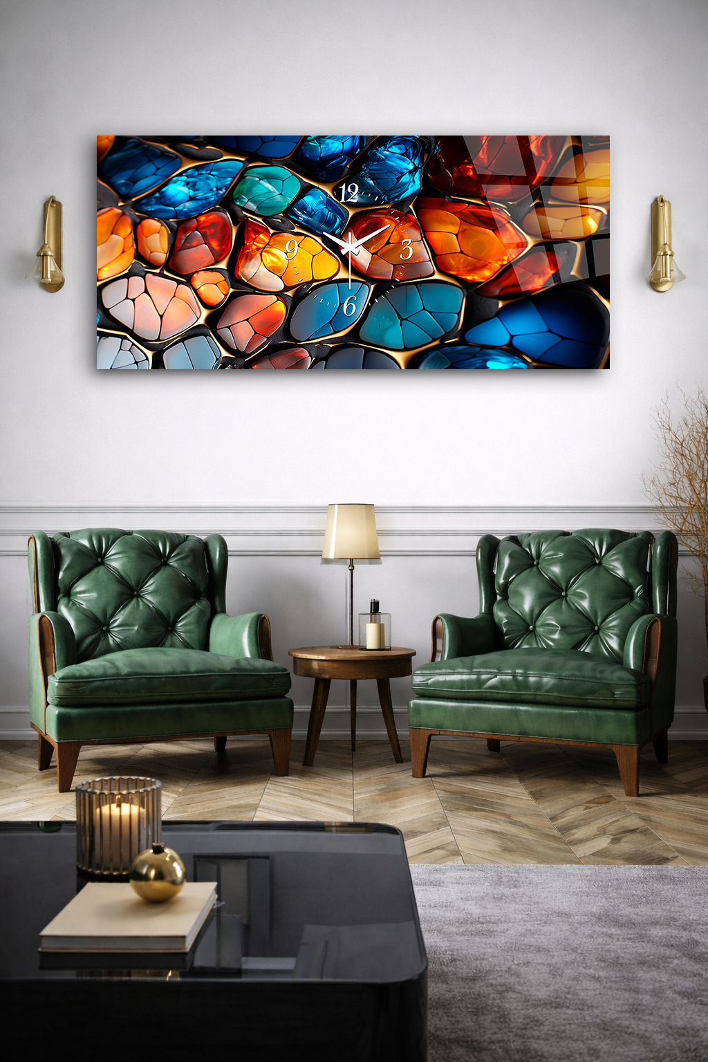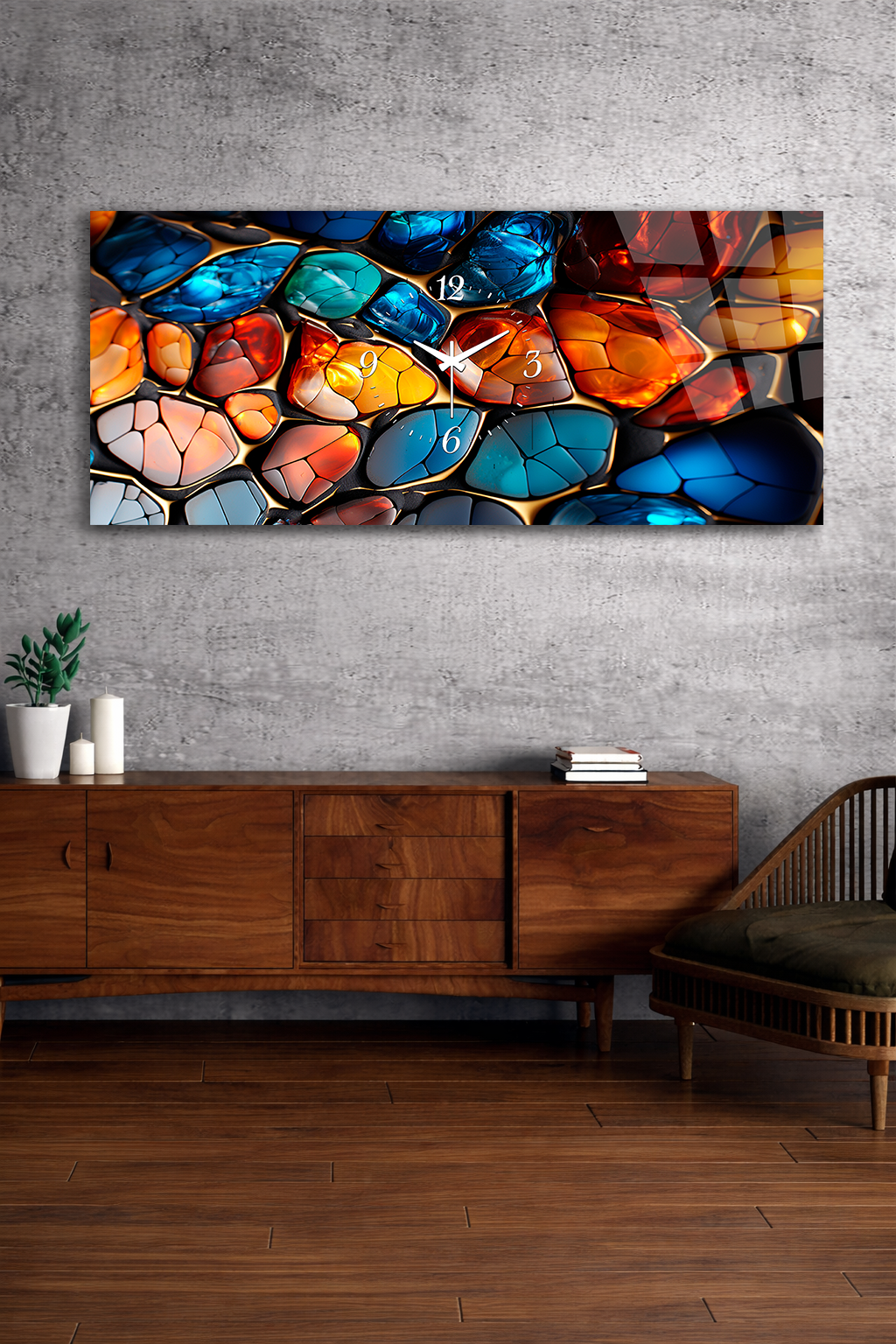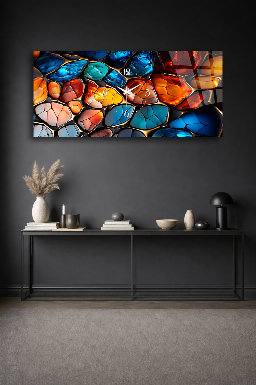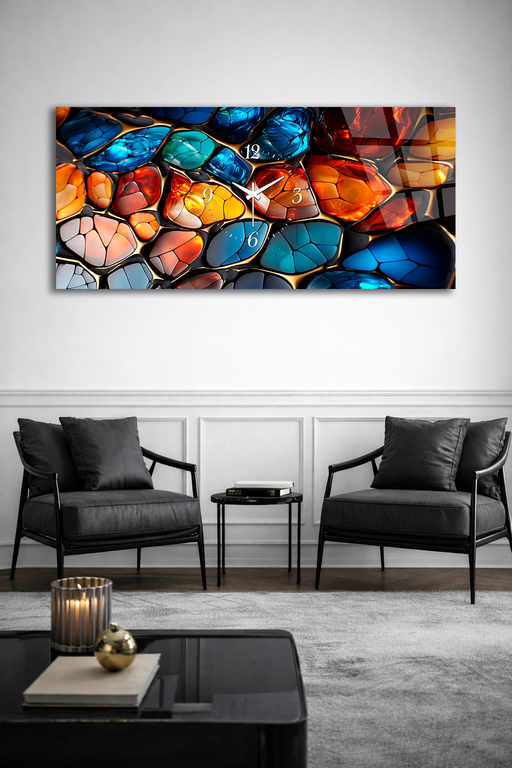 KIRILMAZ CAM DUVAR SAATİ , HEM TABLO HEM SAAT RENKLİ CAM MOZAIK DOKU TASARIM EV OFİS HEDİYESİ
