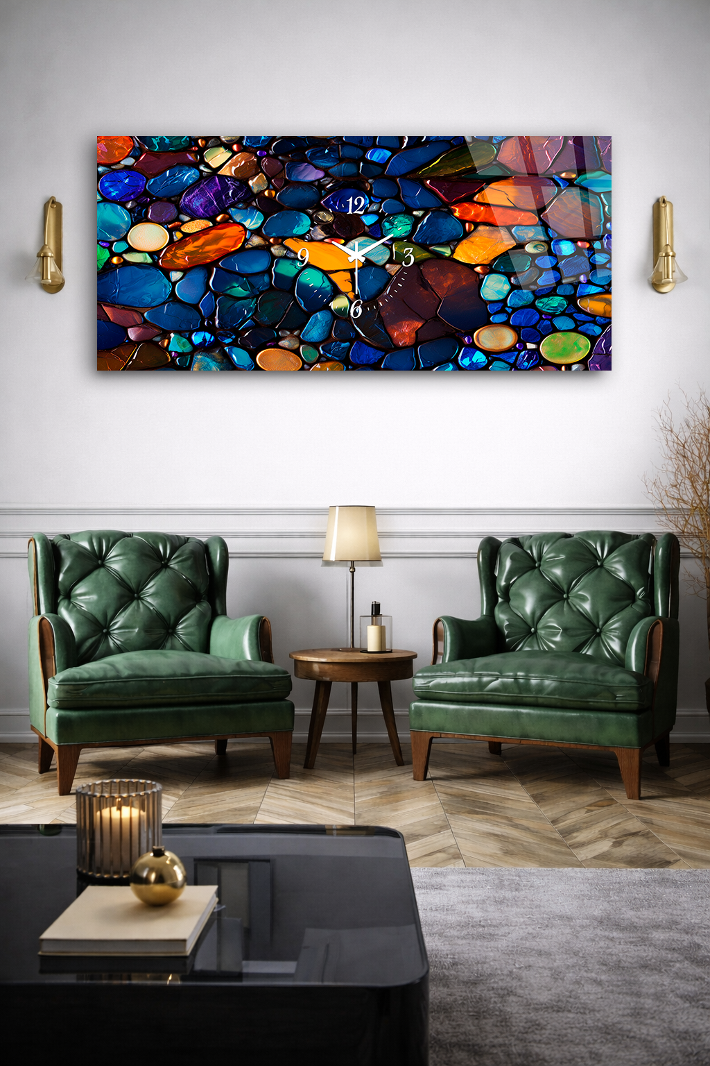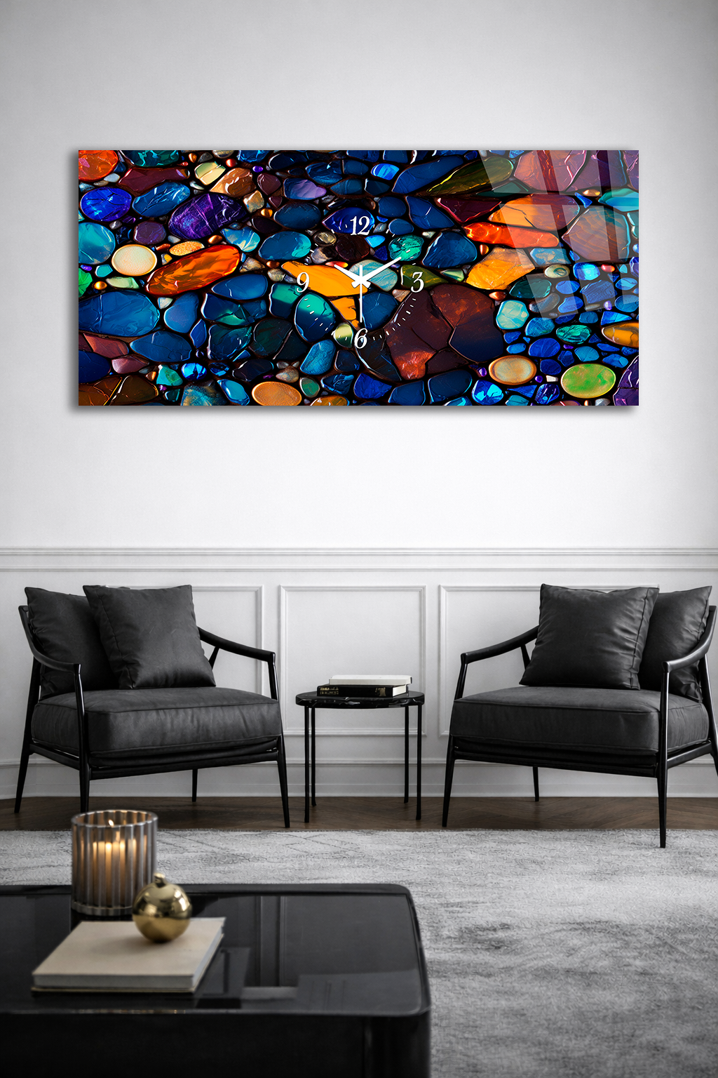 KIRILMAZ CAM DUVAR SAATİ , HEM TABLO HEM SAAT RENKLİ CAM TAŞ DOKU SANATSAL MODERN EV OFİS HEDİYESİ