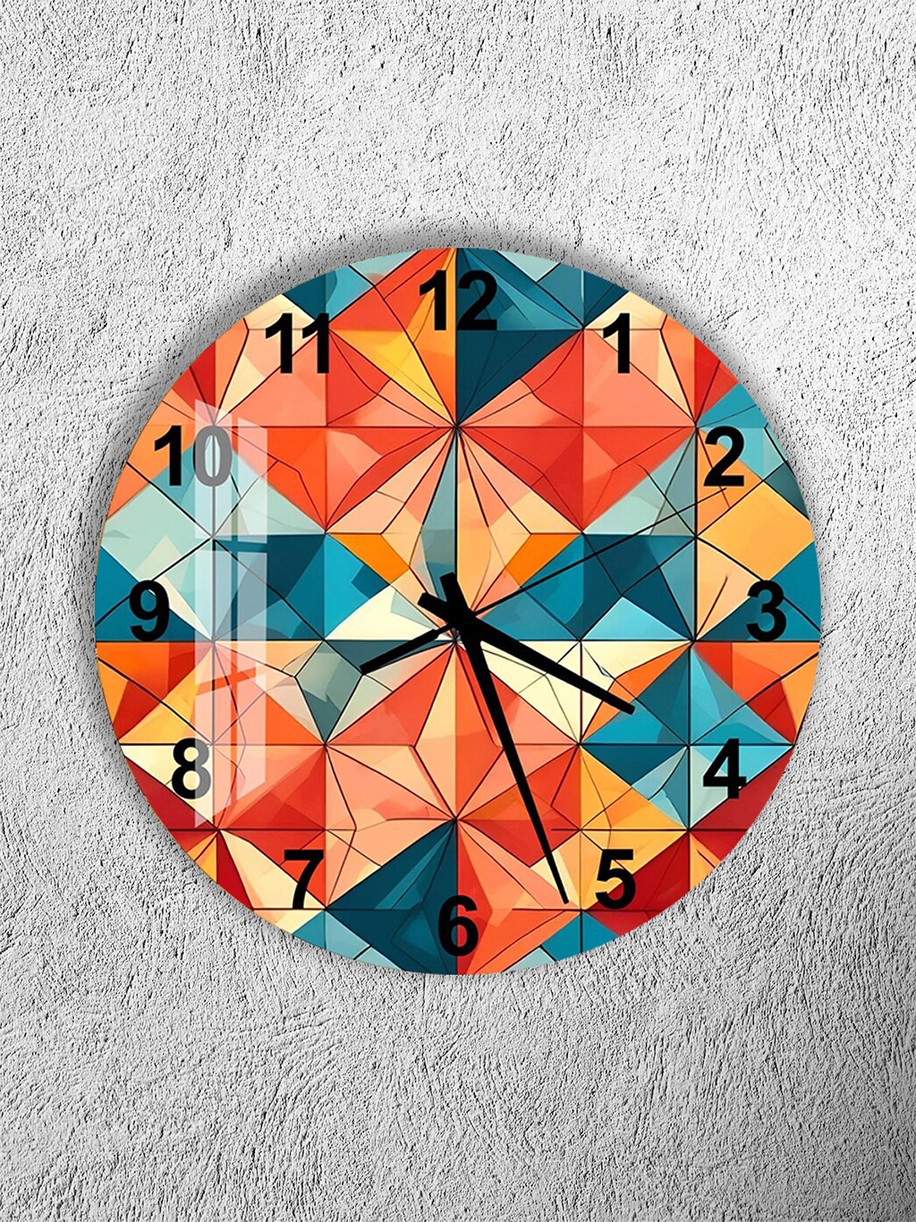 KIRILMAZ CAM DUVAR SAATİ, HEM TABLO HEM SAAT RENKLİ GEOMETRİK ÜÇGEN DESEN EV OFİS HEDİYESİ