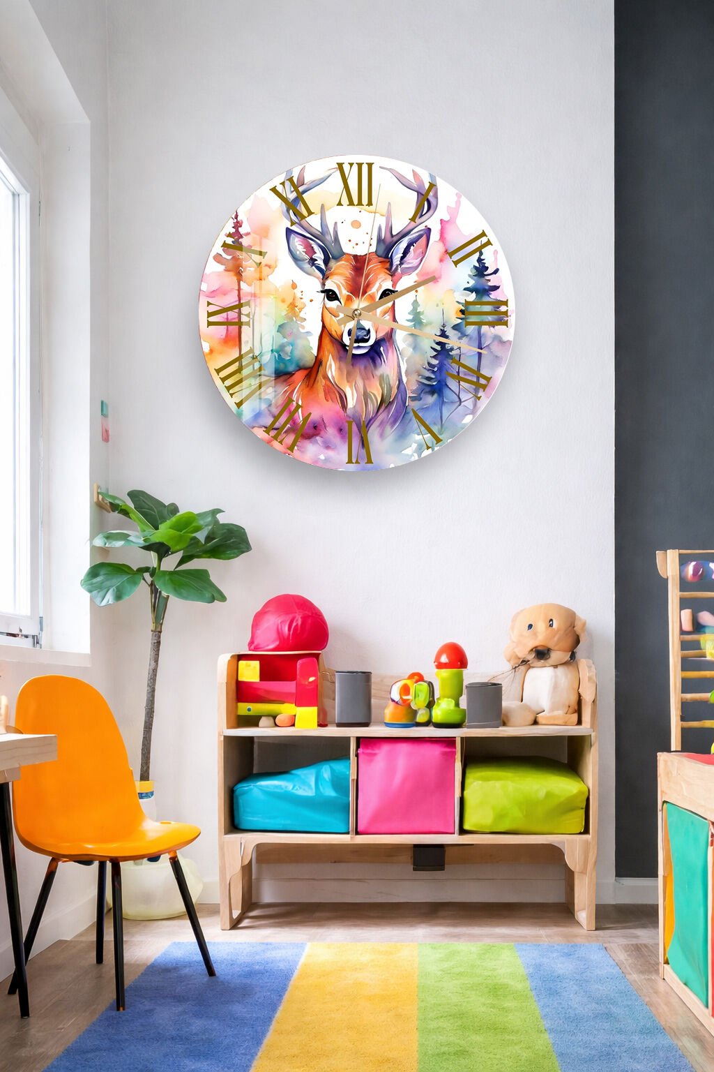KIRILMAZ CAM DUVAR SAATİ, HEM TABLO HEM SAAT RENKLİ GEYİK SULUBOYA DOĞA TASARIM EV OFİS HEDİYESİ