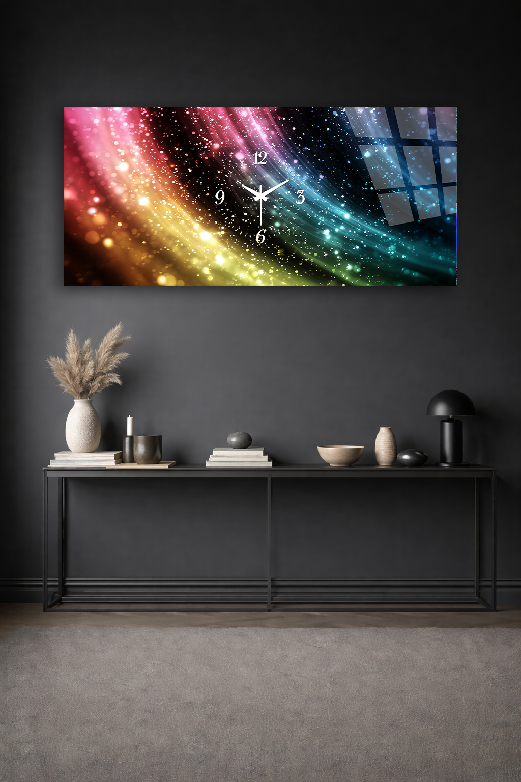 KIRILMAZ CAM DUVAR SAATİ , HEM TABLO HEM SAAT RENKLİ IŞIKLI SOYUT GALAKSİ EV OFİS HEDİYESİ