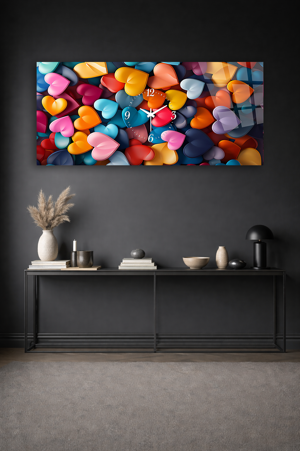 KIRILMAZ CAM DUVAR SAATİ , HEM TABLO HEM SAAT RENKLİ KALP DESEN MODERN TASARIM EV OFİS HEDİYESİ