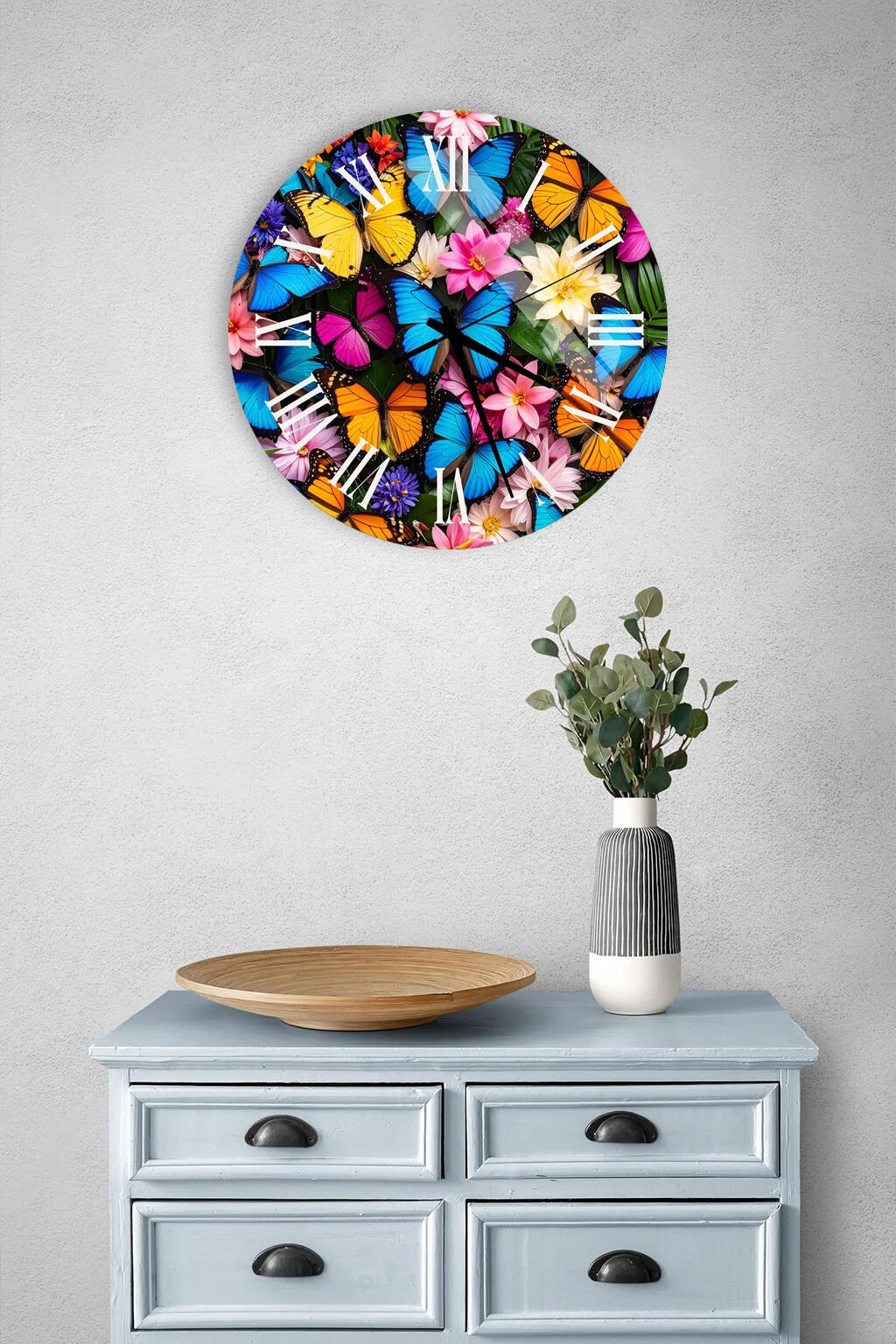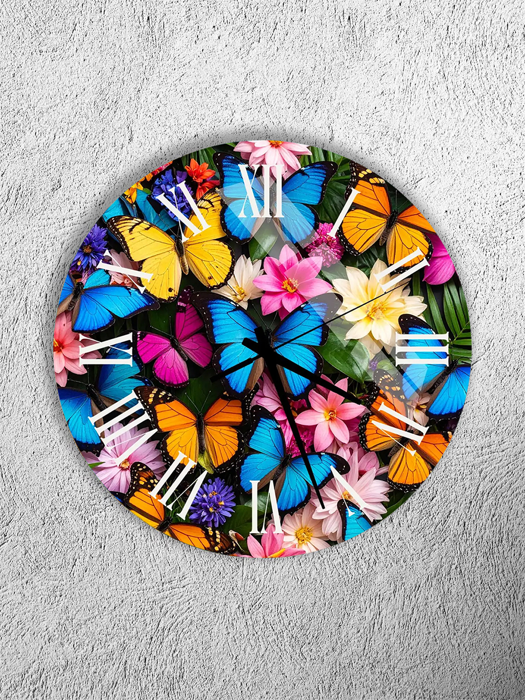KIRILMAZ CAM DUVAR SAATİ, HEM TABLO HEM SAAT RENKLİ KELEBEK VE ÇİÇEK DESENLİ CANLI SANATSAL EV OFİS HEDİYESİ