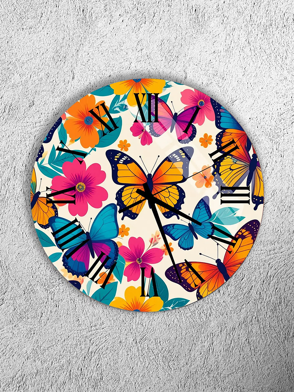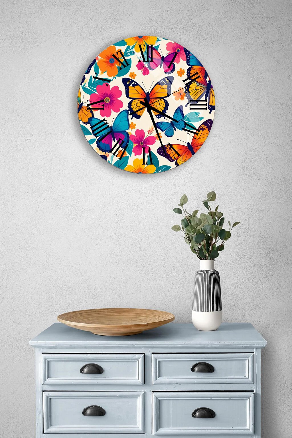 KIRILMAZ CAM DUVAR SAATİ , HEM TABLO HEM SAAT RENKLİ KELEBEK VE ÇİÇEK DESENLİ TASARIM EV OFİS HEDİYESİ