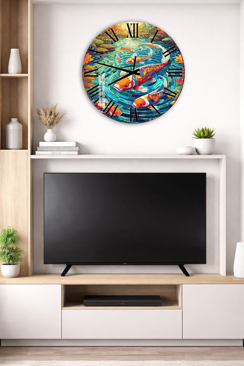 KIRILMAZ CAM DUVAR SAATİ, HEM TABLO HEM SAAT RENKLİ KOİ BALIKLARI JAPON SANATI EV OFİS HEDİYESİ