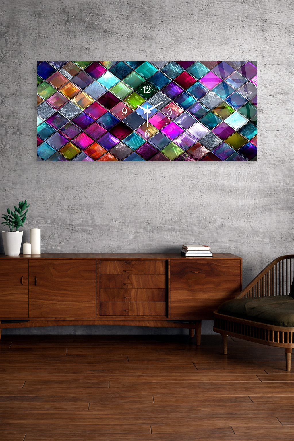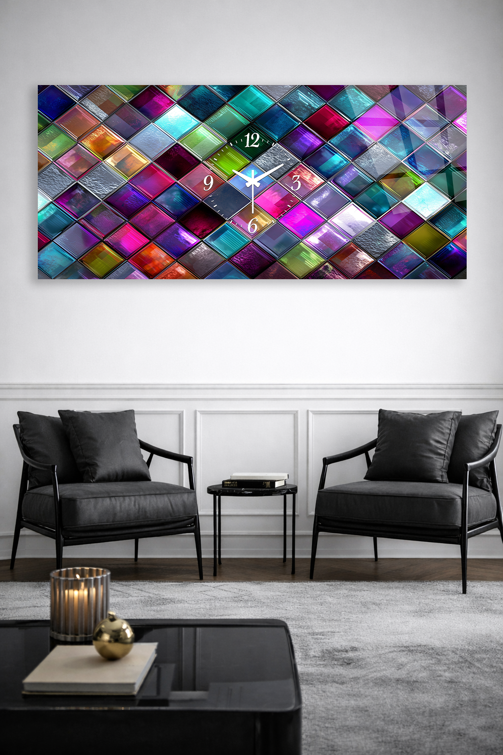 KIRILMAZ CAM DUVAR SAATİ, HEM TABLO HEM SAAT RENKLİ MOZAİK CAM TASARIM EV OFİS HEDİYESİ