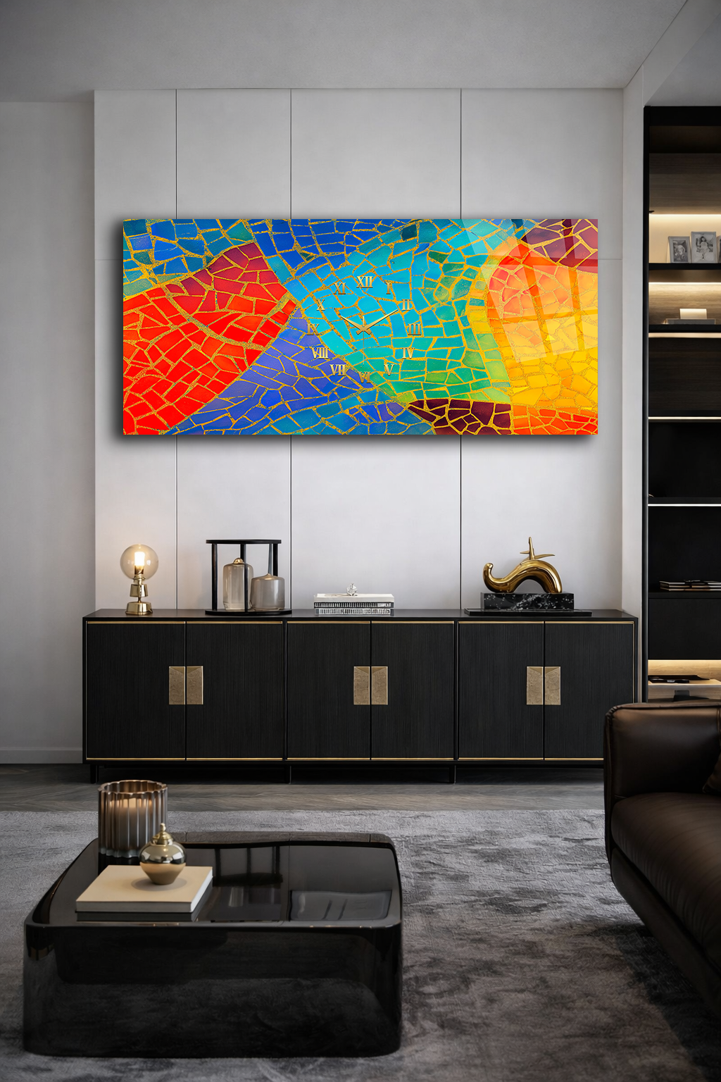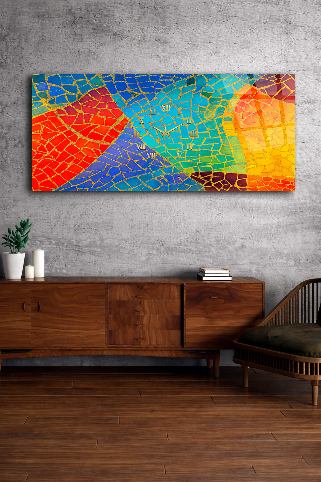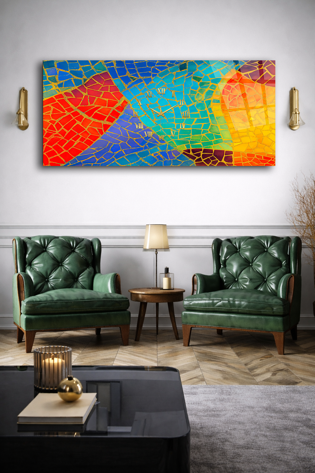 KIRILMAZ CAM DUVAR SAATİ , HEM TABLO HEM SAAT RENKLİ MOZAİK SOYUT SANAT TASARIMI EV OFİS HEDİYESİ