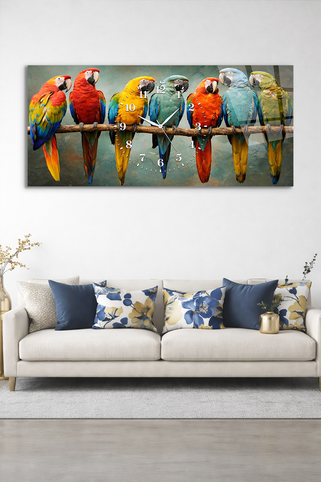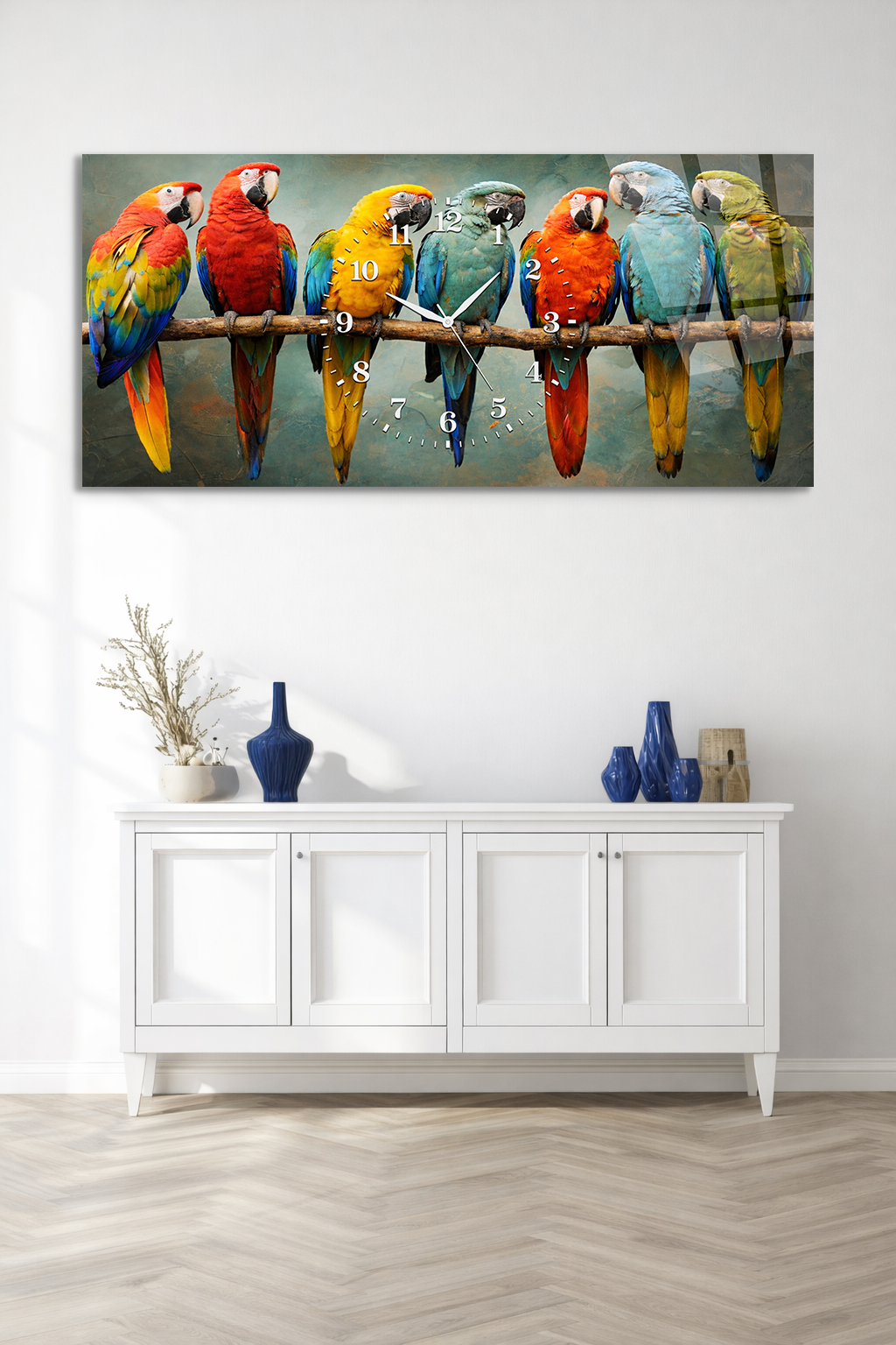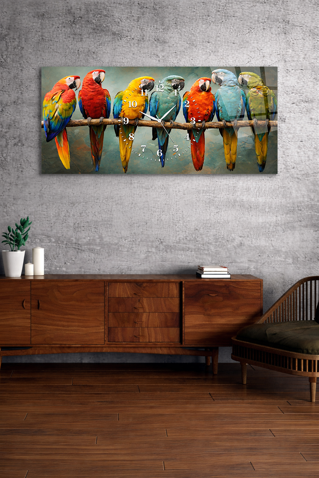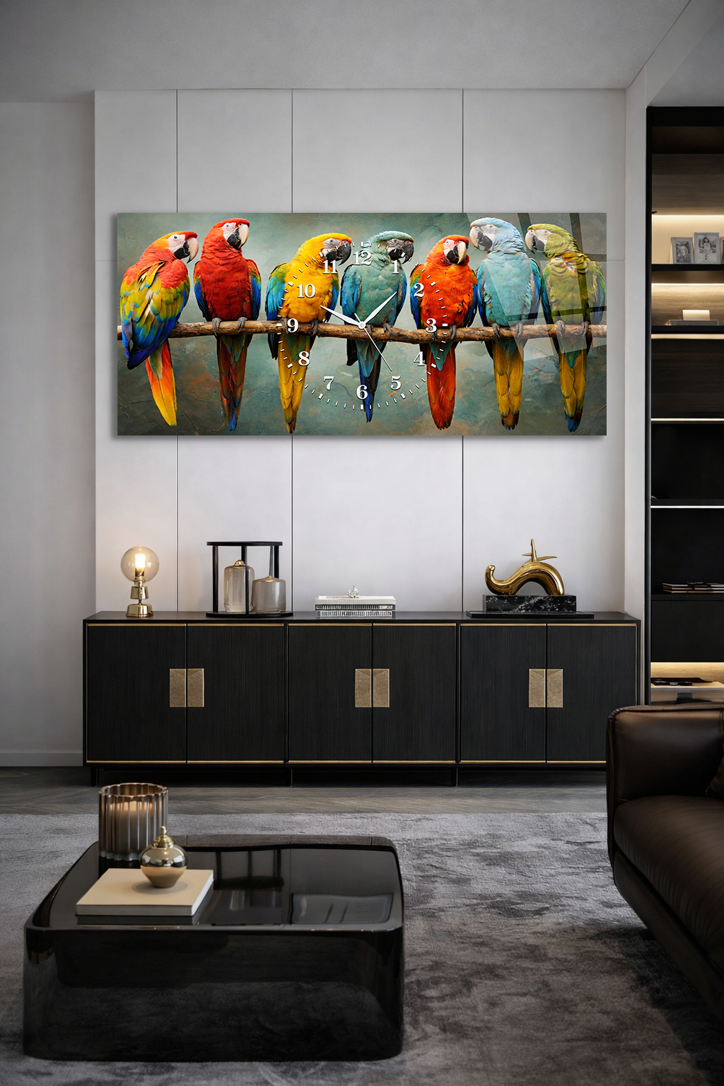 KIRILMAZ CAM DUVAR SAATİ, HEM TABLO HEM SAAT RENKLİ PAPAĞANLAR TASARIM EV OFİS HEDİYESİ