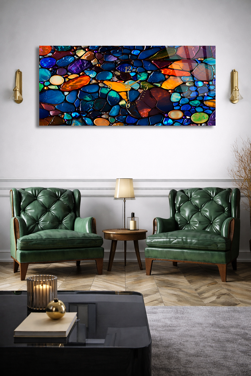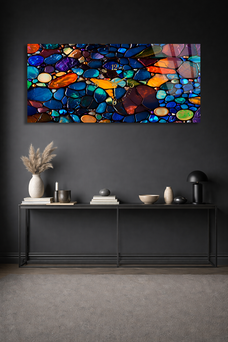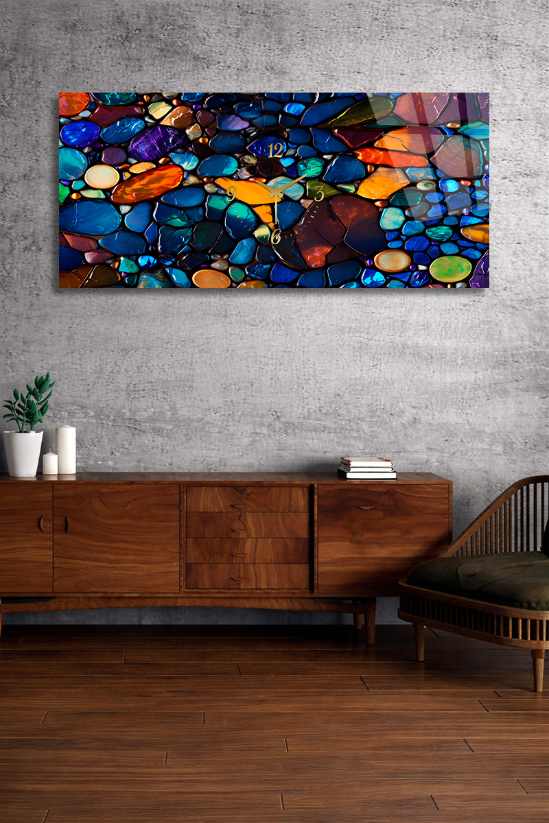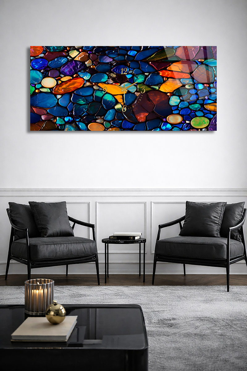 KIRILMAZ CAM DUVAR SAATİ , HEM TABLO HEM SAAT RENKLİ TAŞ DESEN MODERN EV OFİS HEDİYESİ