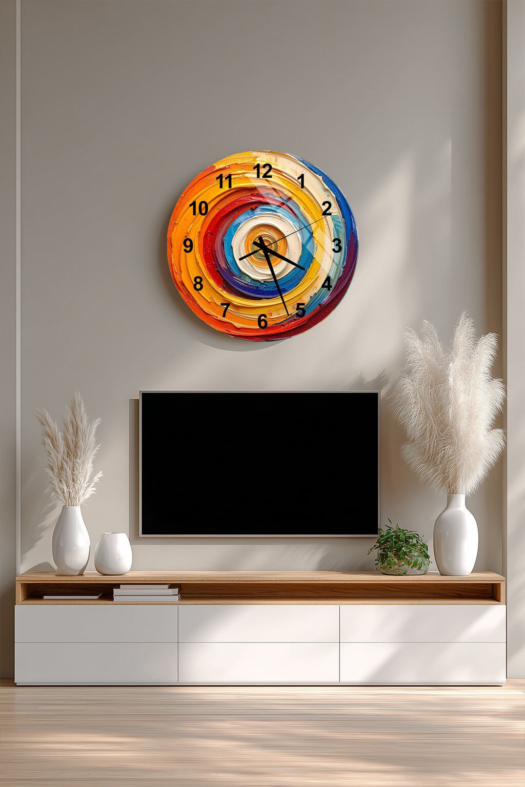 KIRILMAZ CAM DUVAR SAATİ, HEM TABLO HEM SAAT RENKLİ YAĞLI BOYA DOKULU SANATSAL TASARIM EV OFİS HEDİYESİ