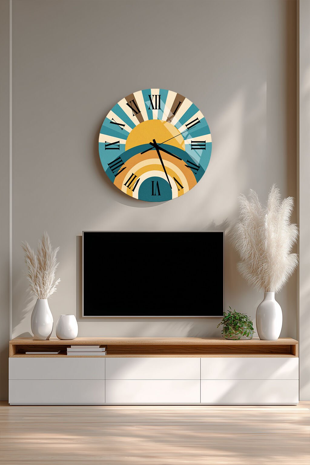 KIRILMAZ CAM DUVAR SAATİ, HEM TABLO HEM SAAT RETRO GÜNEŞ VE DALGA DESENLİ SANATSAL TASARIM EV OFİS HEDİYESİ