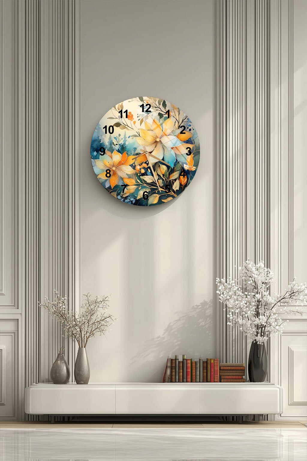 KIRILMAZ CAM DUVAR SAATİ, HEM TABLO HEM SAAT SARI MAVİ ÇİÇEK DESEN SANATSAL EV OFİS HEDİYESİ