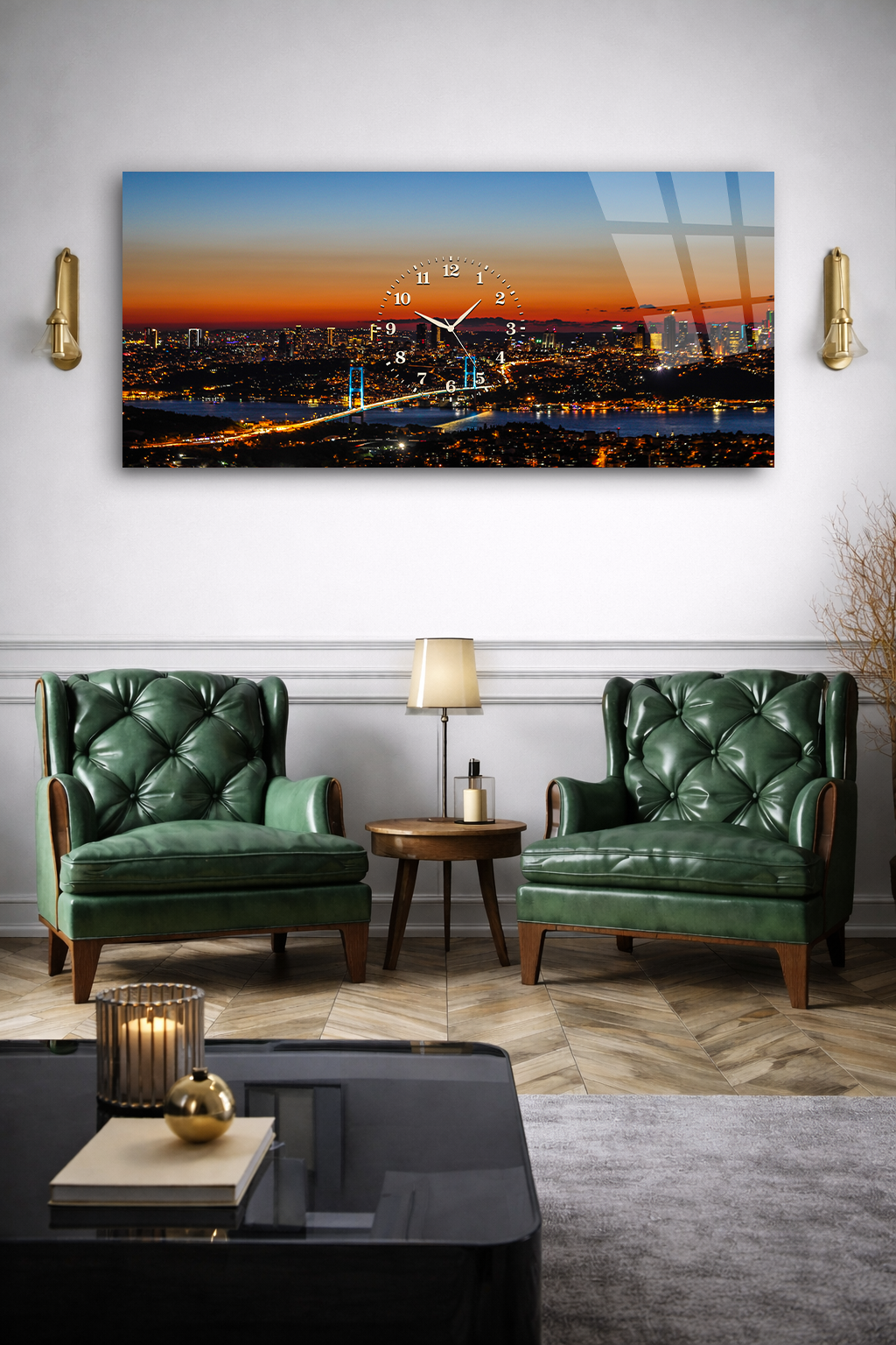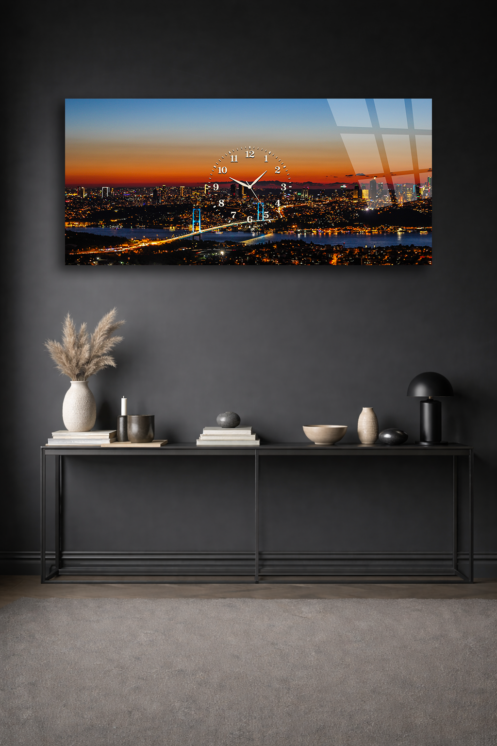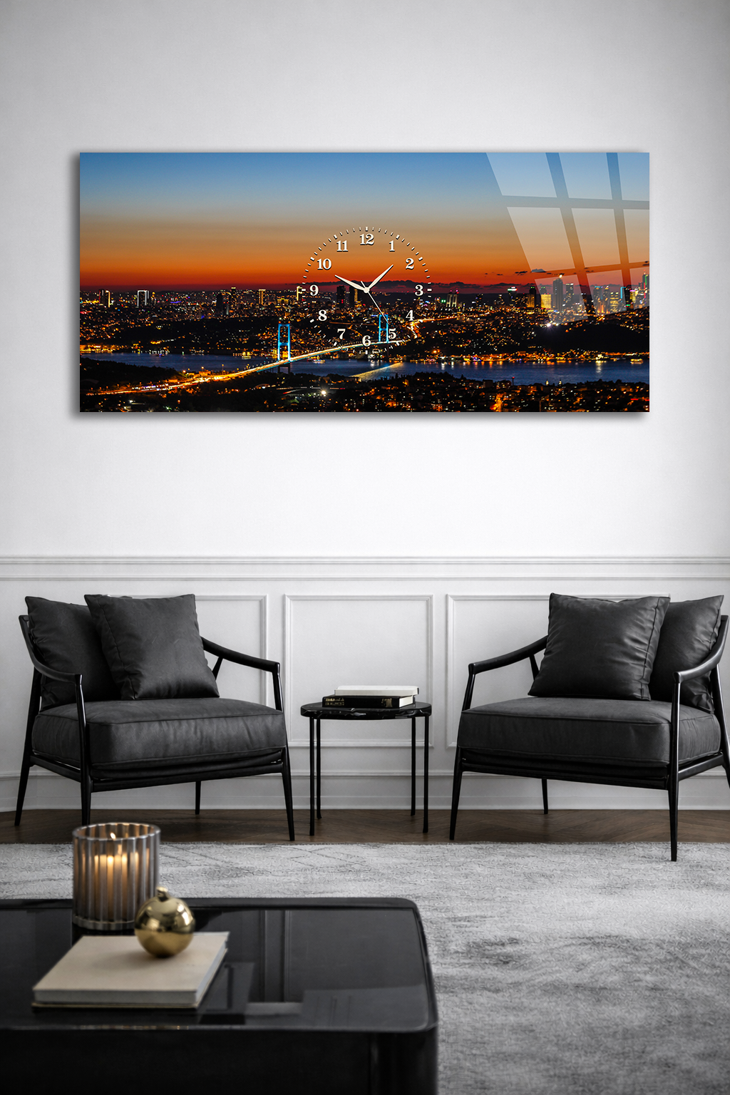 KIRILMAZ CAM DUVAR SAATİ , HEM TABLO HEM SAAT ŞEHİR MANZARASI GÜN BATIMI EV OFİS HEDİYESİ