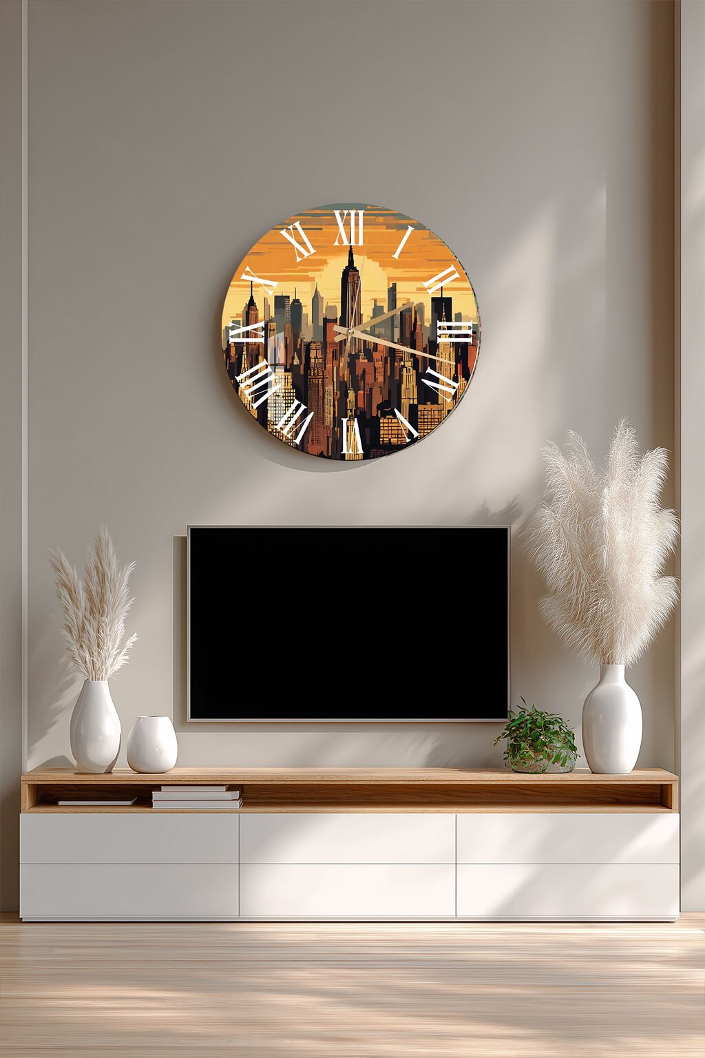 KIRILMAZ CAM DUVAR SAATİ, HEM TABLO HEM SAAT ŞEHİR SİLÜETİ GÜN BATIMI MODERN TASARIM EV OFİS HEDİYESİ