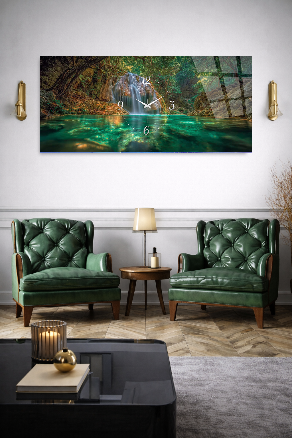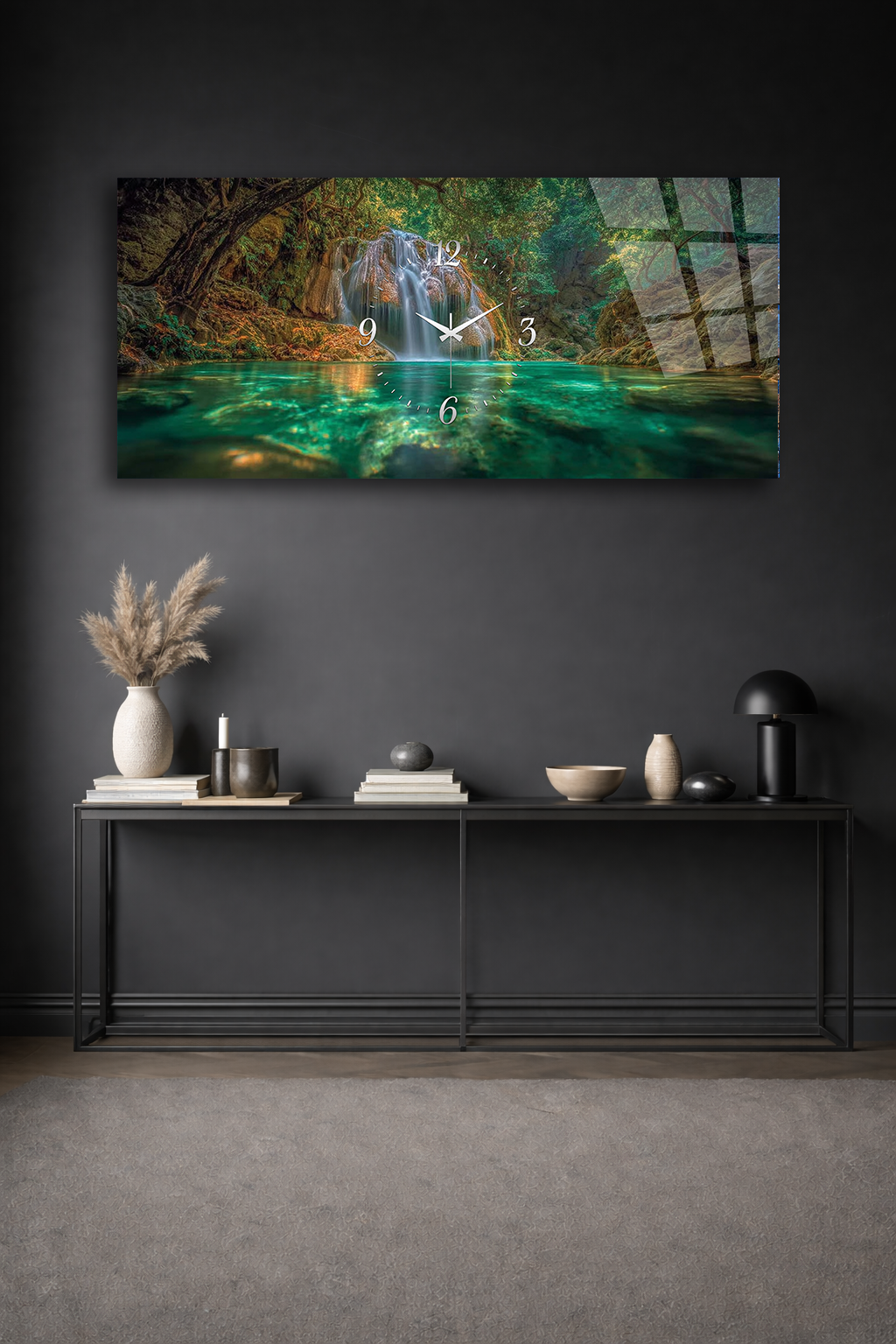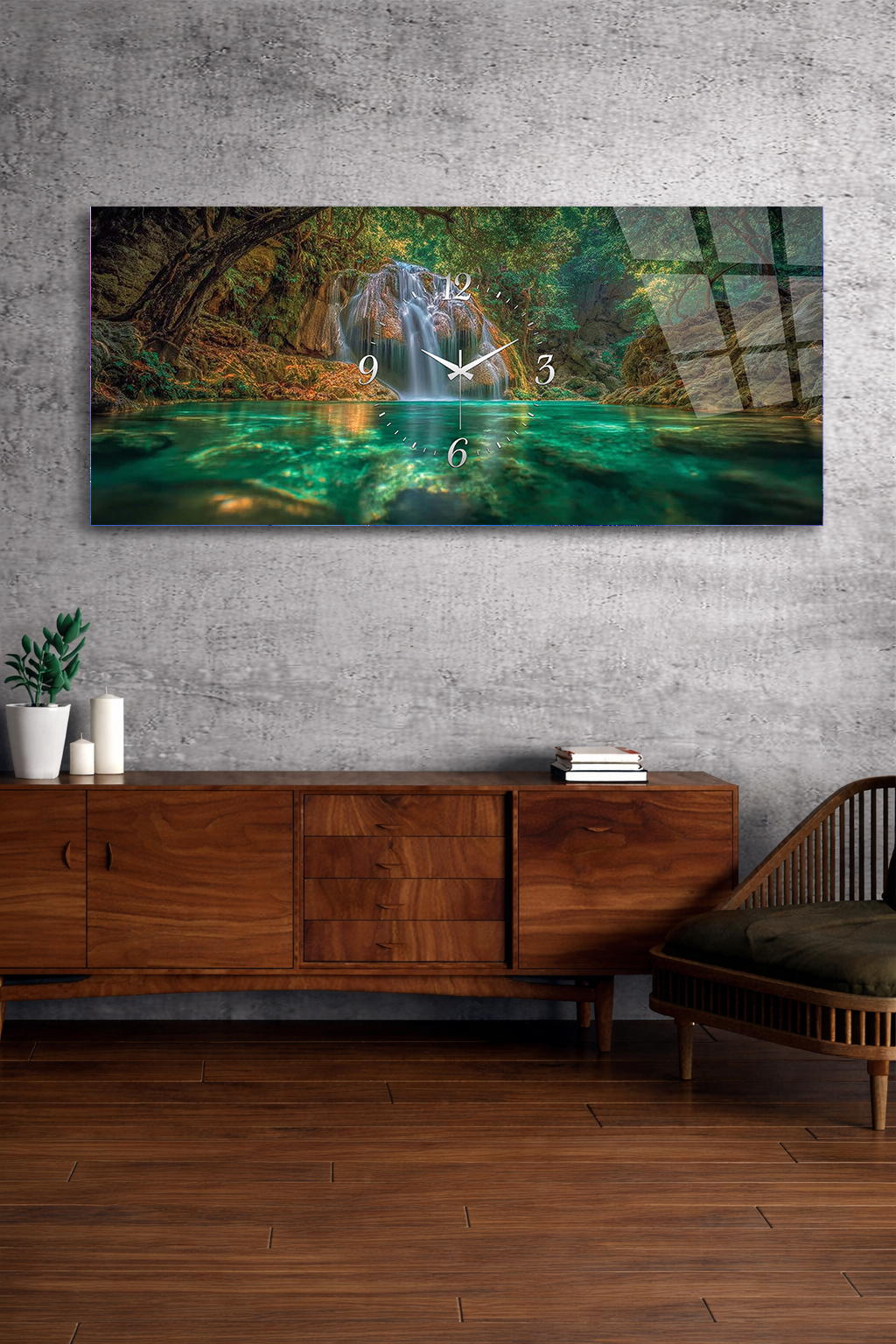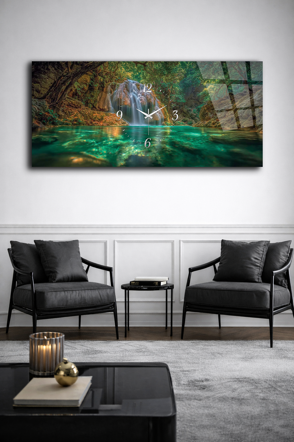 KIRILMAZ CAM DUVAR SAATİ , HEM TABLO HEM SAAT ŞELALE DOĞA MANZARASI EV OFİS HEDİYESİ