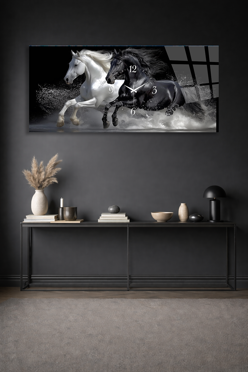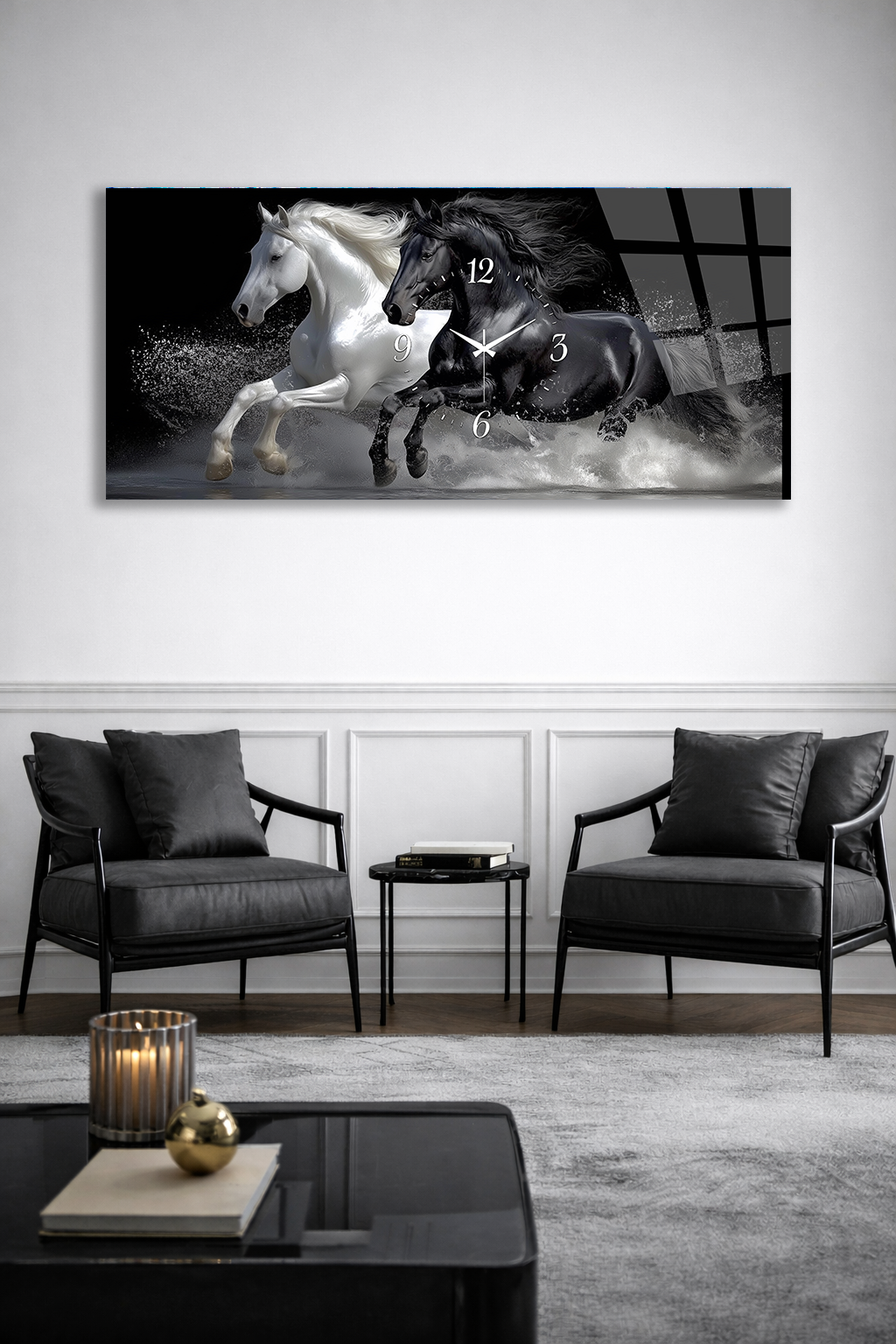 KIRILMAZ CAM DUVAR SAATİ , HEM TABLO HEM SAAT SİYAH BEYAZ AT FIGÜRÜ MODERN TASARIM EV OFİS HEDİYESİ