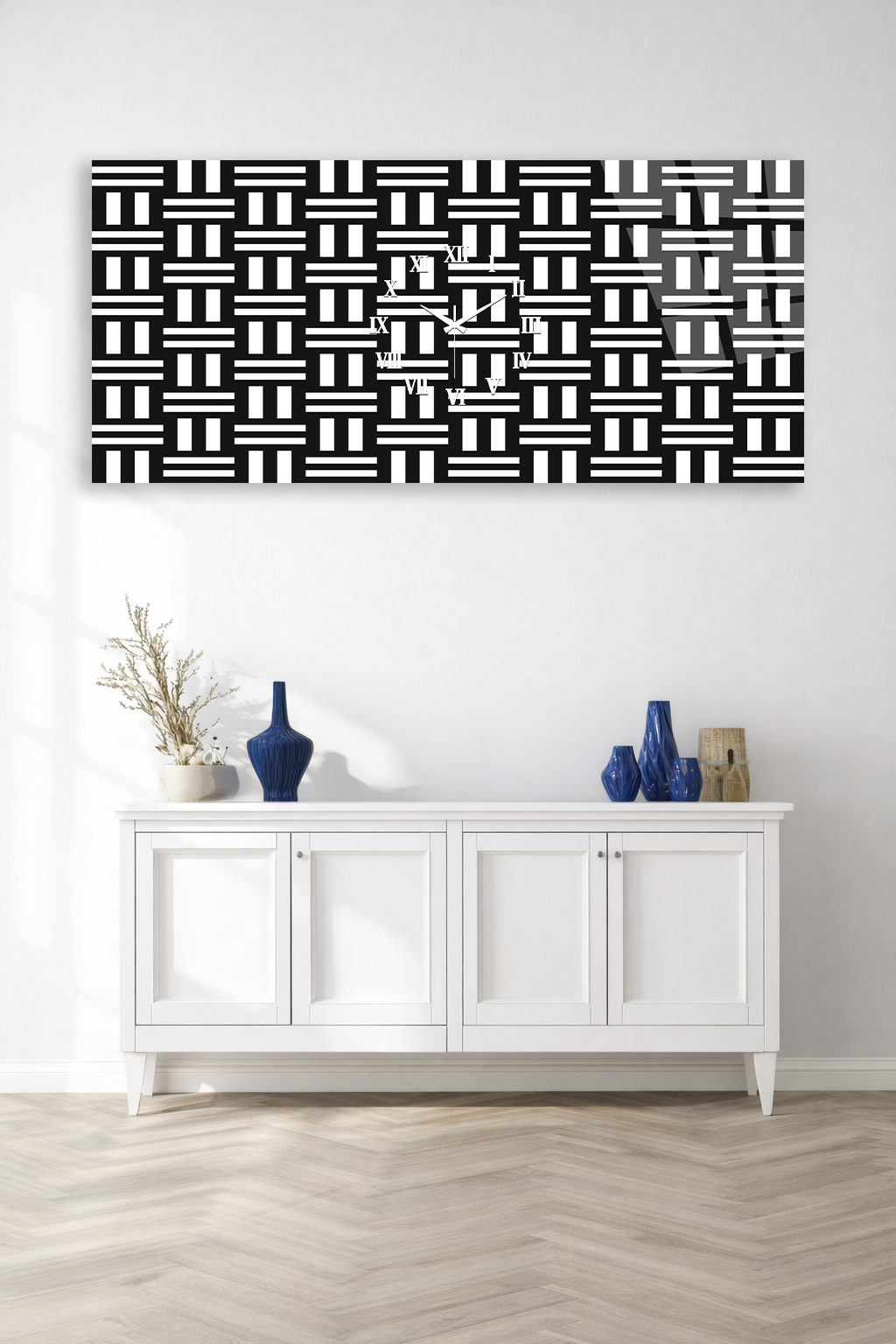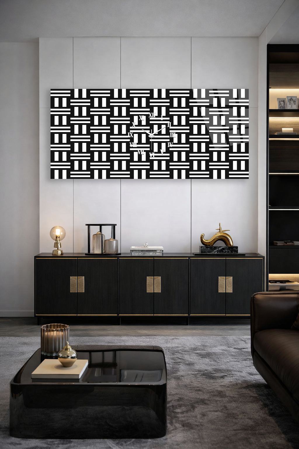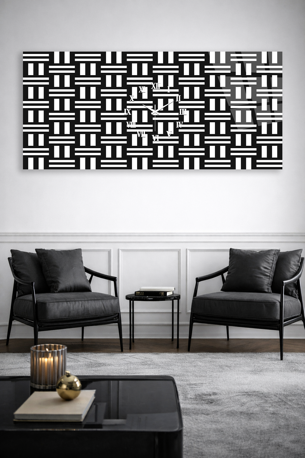 KIRILMAZ CAM DUVAR SAATİ HEM TABLO HEM SAAT SİYAH BEYAZ GEOMETRİK EV OFİS HEDİYESİ