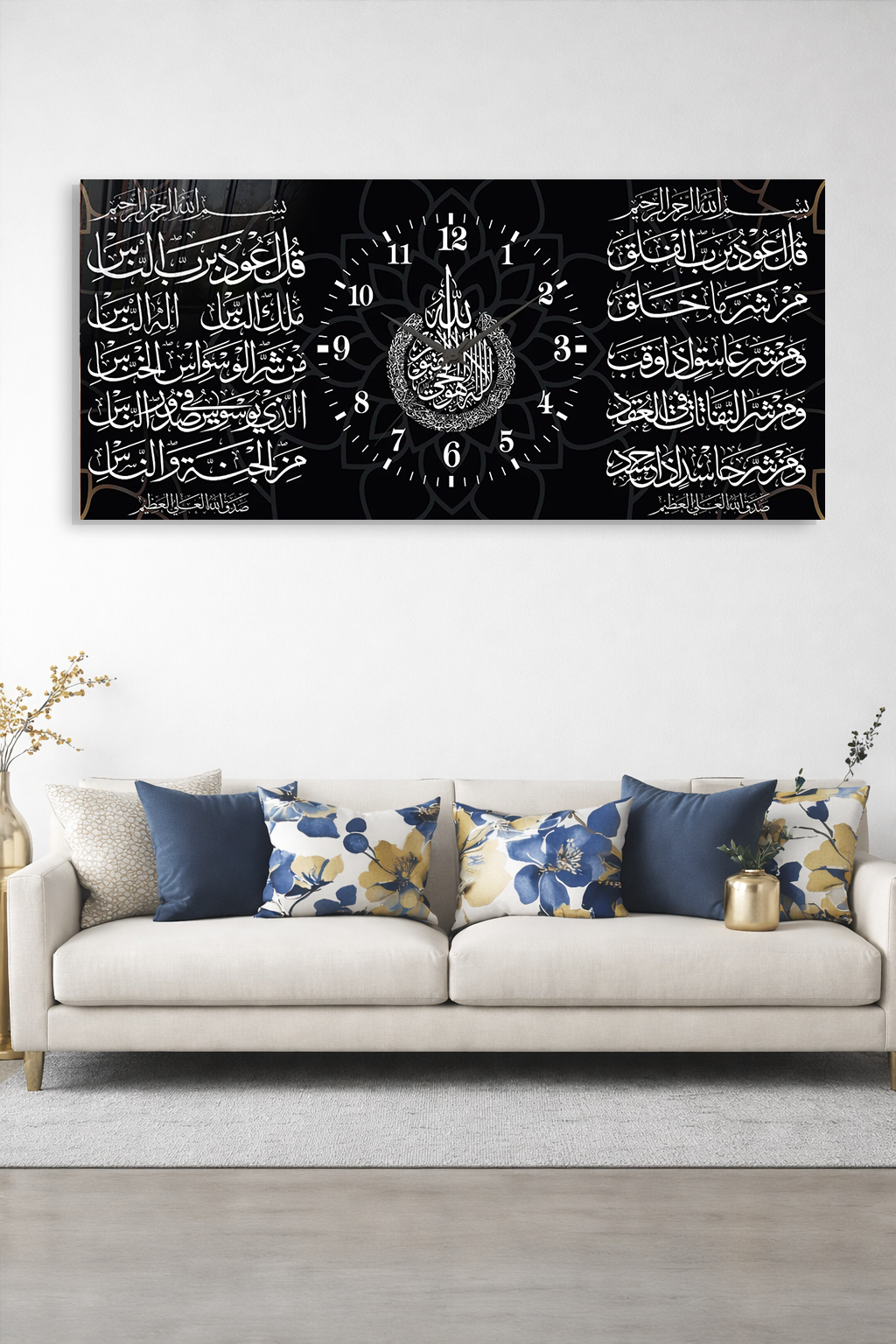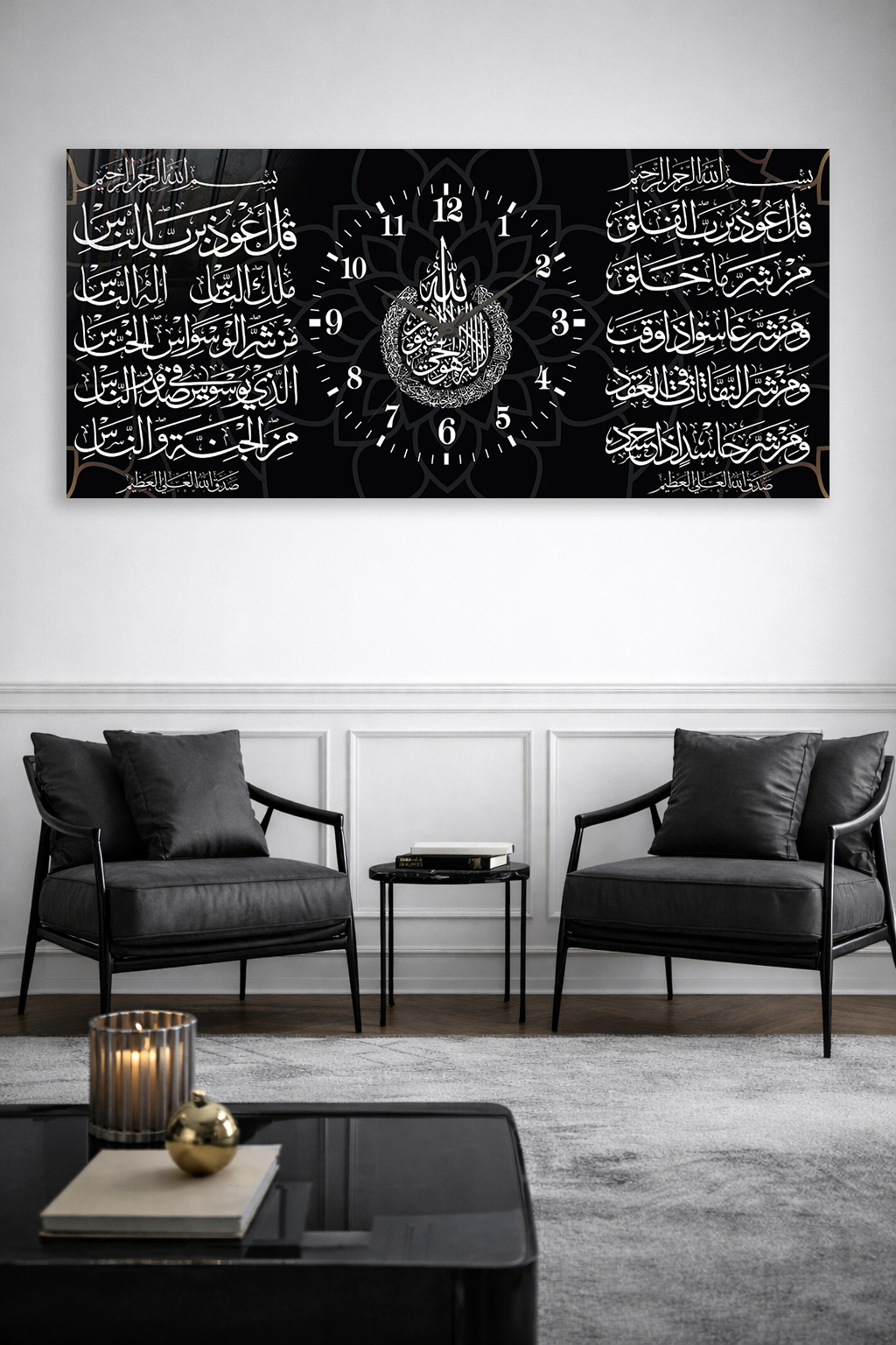 KIRILMAZ CAM DUVAR SAATİ , HEM TABLO HEM SAAT SİYAH BEYAZ İSLAMİ HAT EV OFİS HEDİYESİ