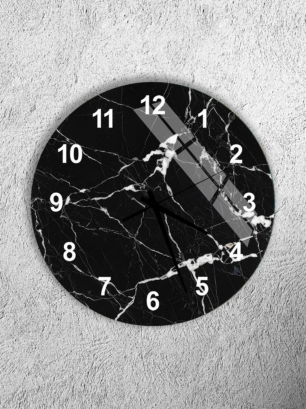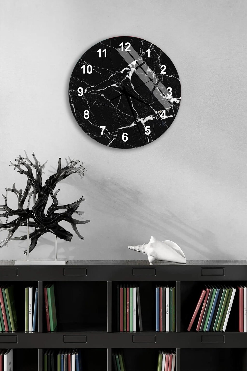 KIRILMAZ CAM DUVAR SAATİ, HEM TABLO HEM SAAT SİYAH BEYAZ MERMER MODERN EV OFİS HEDİYESİ