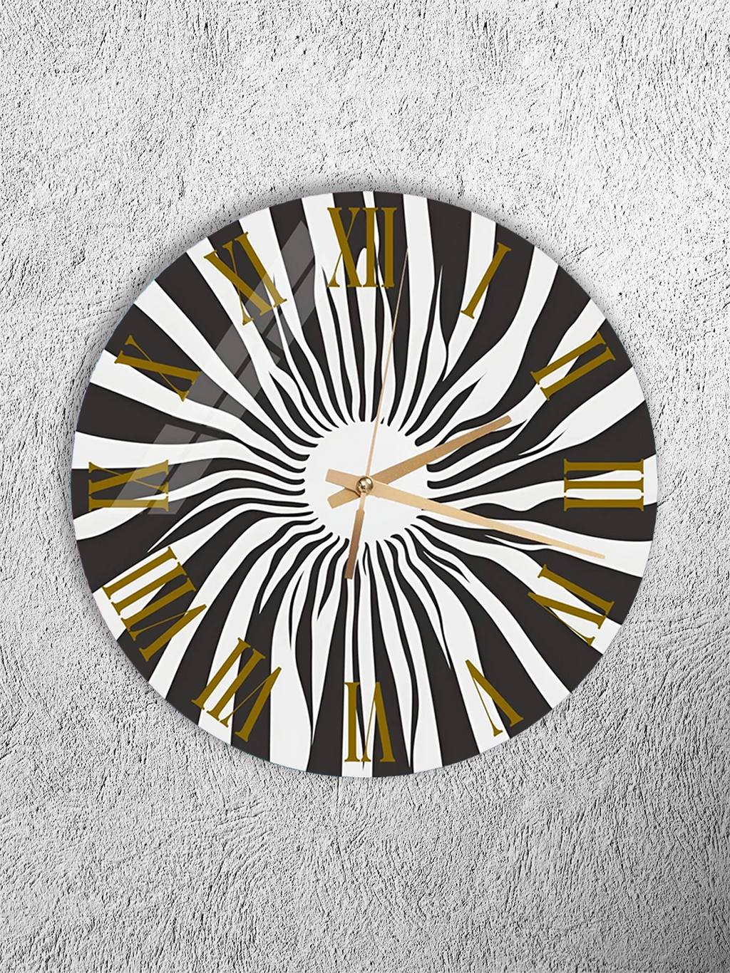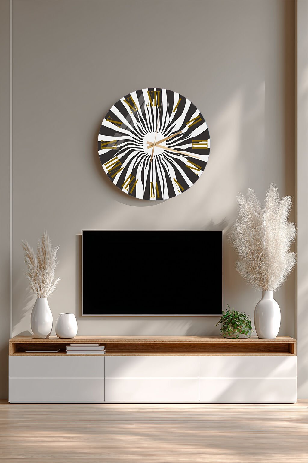 KIRILMAZ CAM DUVAR SAATİ, HEM TABLO HEM SAAT SİYAH BEYAZ SPİRAL MODERN SANAT TASARIM EV OFİS HEDİYESİ